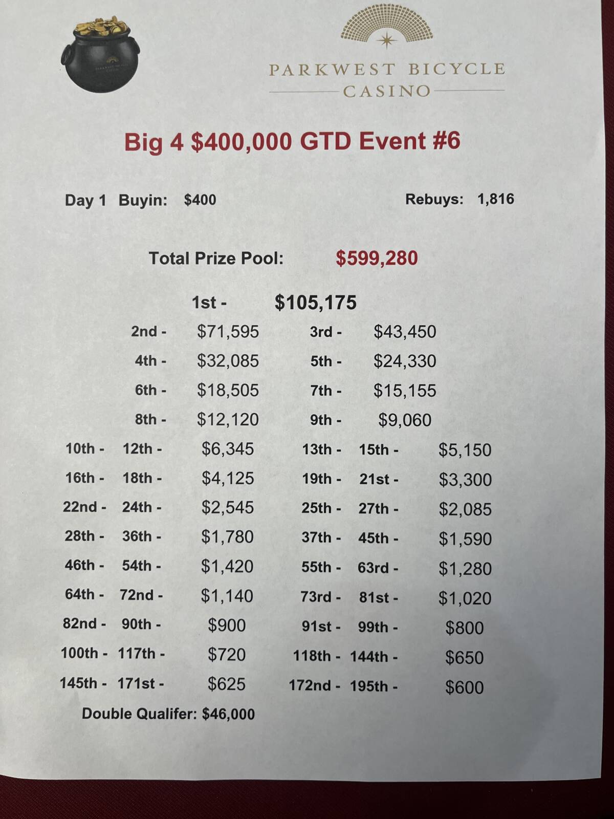 11 AM – $400,000 Guaranteed Big 4 Day 2 Finals.