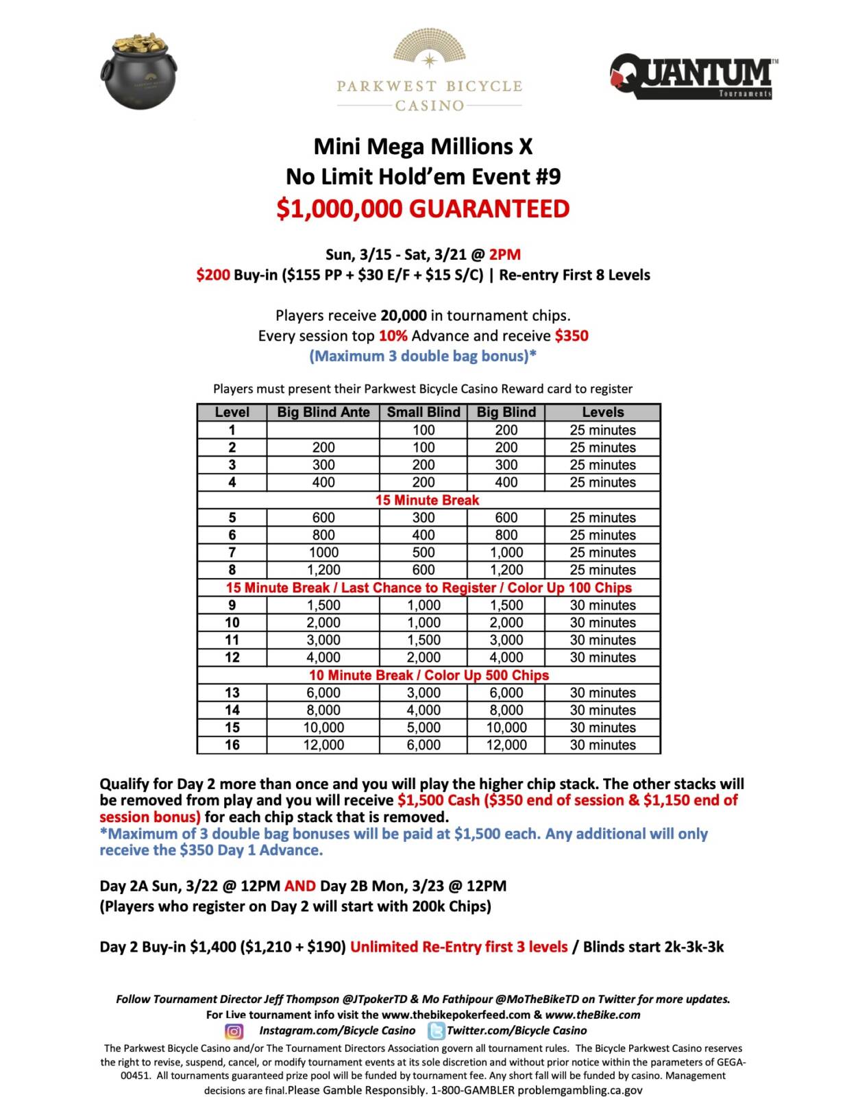 2 PM – $300,000 Guaranteed Afternoon Flight. $300 buy-in. Players start with 25,000 in chips. Top 10% advance to Day 2 +$500 Registration open until 5:30 PM. Day 2 restart on Friday, October 13th