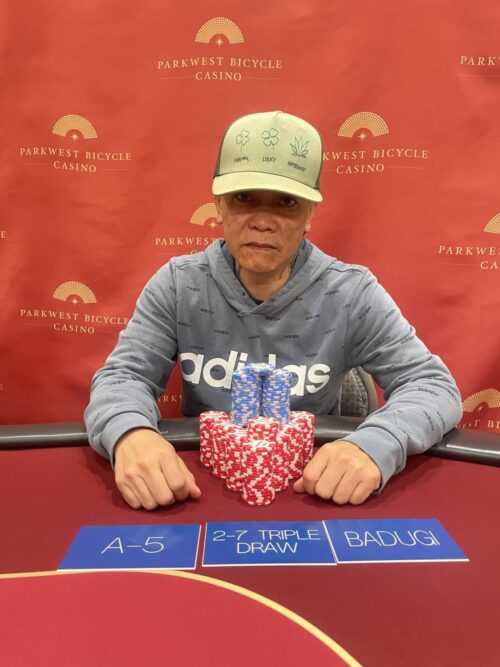 Yesterday saw only 17 players come out for the Triple Draw Event, meaning we had an overlay of nearly $3,000, which was of course covered by the Parkwest Bicycle Casino. It was a proverbial whose who of Bike regulars at the end, with Quoc Le chopping with Taxi Vargas, which Beth Hall showed she’s more than a Hold’em expert with a third place showing here.