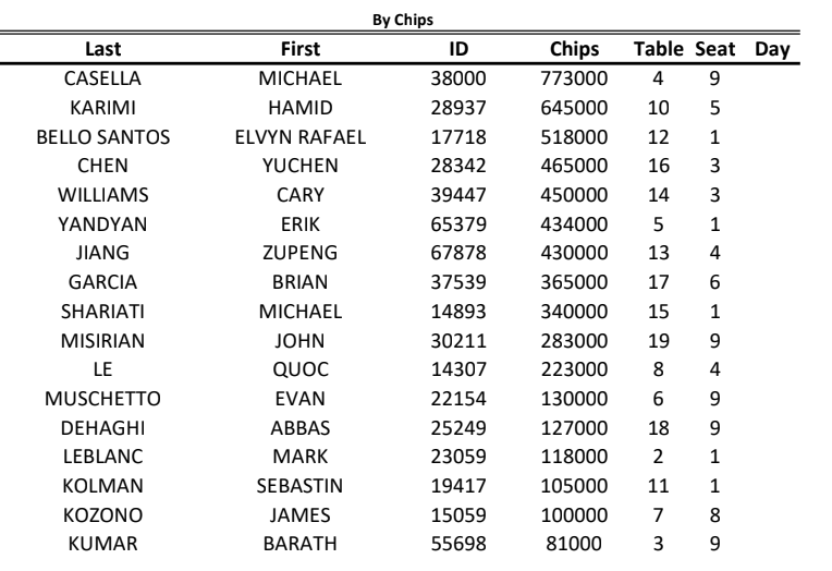 Yesterday saw 17 players move on to the Day 2 finals on Sunday, and it is a list full of Bike regulars and familiar faces. Leading the way is Michael Casella (pictured above), who took down three different events at the Legends of Poker just last month. He is the early chip leader in this event with 773,000, along with two former Mega Millions champions: Yuchen Chen and Mike Shariati.