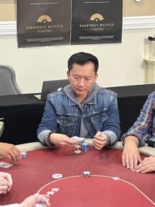 We have just 45 players remaining in our opening flight today, meaning two-thirds of the remaining field will be advancing from the remaining field. Bike regulars and recent winners here Marc Fiorentino and Victor Kruglov are near the top of the counts, but everyone is chasing Mega Millions champion Duey Duong (pictured above), who is nearing 500,000 in chips today.