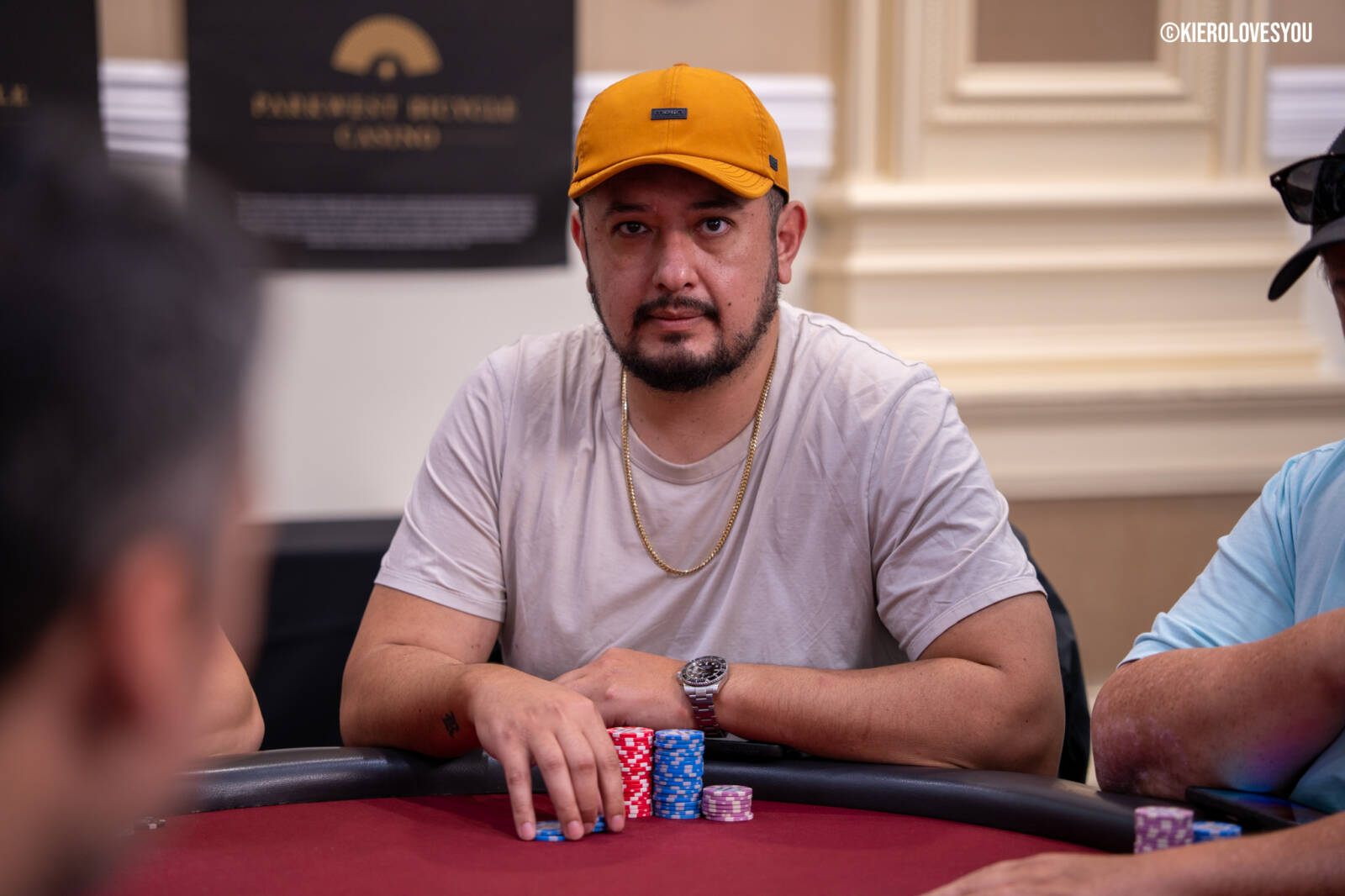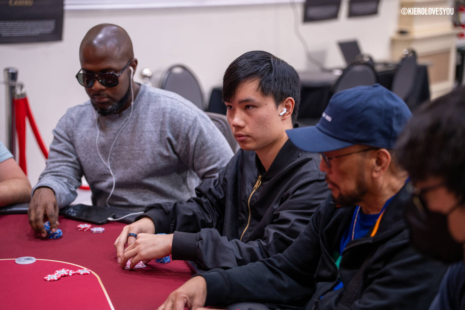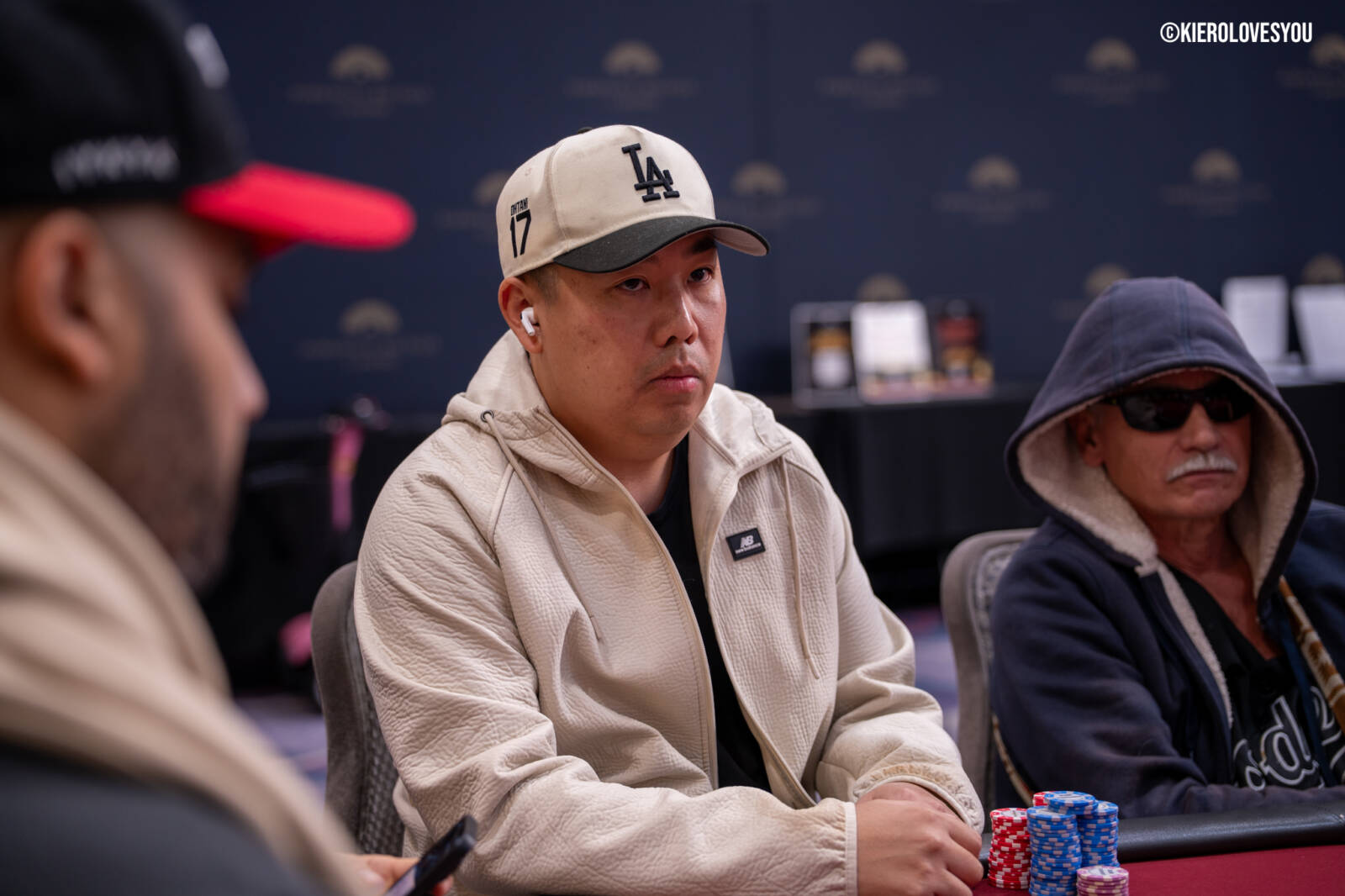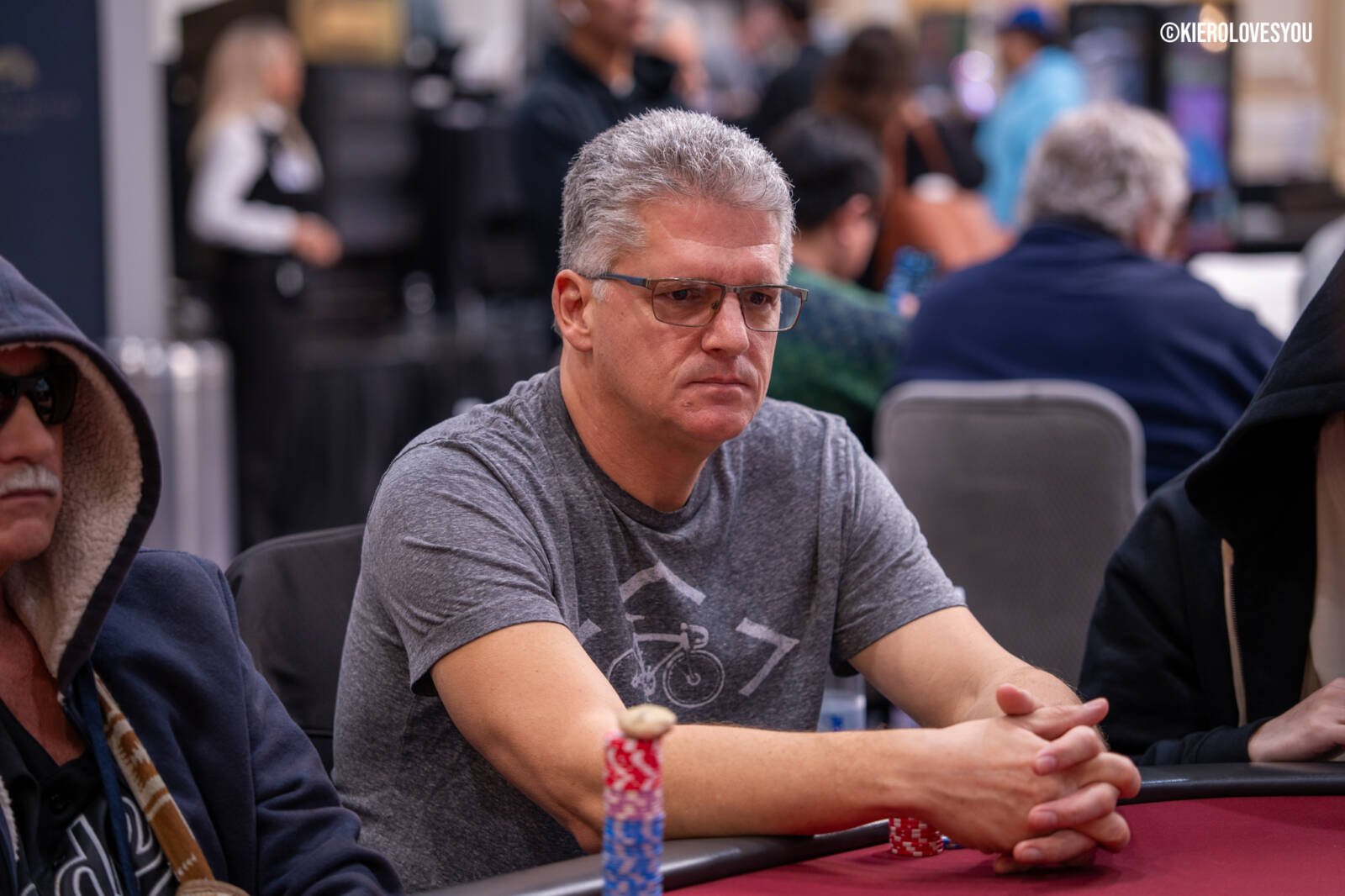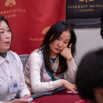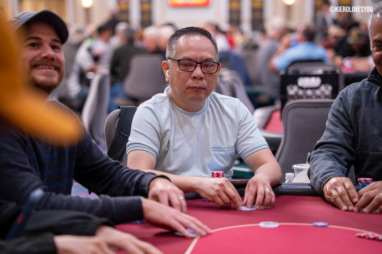 Danny Geyser (PICTURED ABOVE) came in at 3rd largest stack of the day with 799,000 and has risen to 1.3 Million in chips to take the lead for now. Jonah Lopas and Huy Nguyen both losing a few chip but in the top 5 stacks still. Tournament Pros and locals in the field having a good time here at the Parkwest Bicycle Casino as we will update you with more as the day progresses. Players will break at the end of level 18.