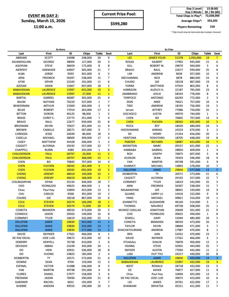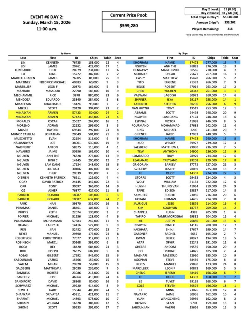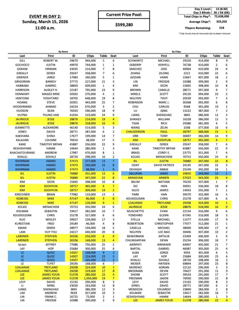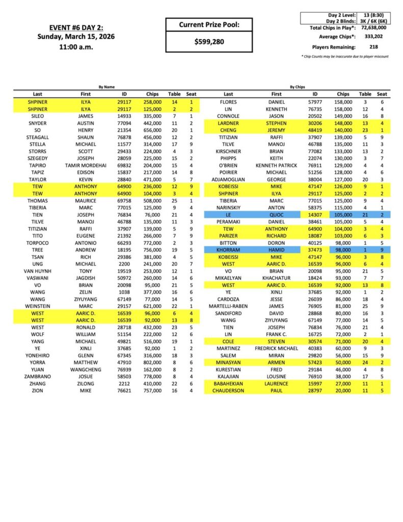 You can view the full list of chip counts so far below, and come back later for the full payouts.