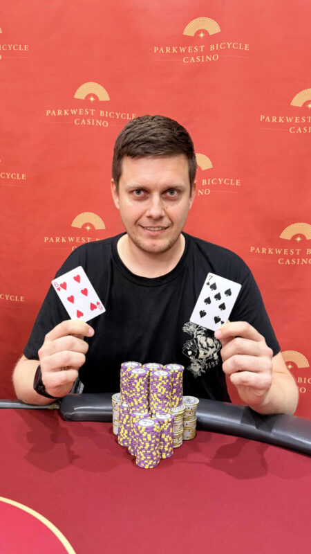 Last night saw the final four players in the $20,000 Guaranteed chop up the prizepool, and there were a couple of familiar faces involved. Bike regular Mike Eskandari took home over $4,400, while Bike floorman and part time poker crusher Larry Serbryany finished on top of the chop with nearly $5,700. Vladislav Simonenko (pictured above) negotatied for the winner’s photo and trophy. Congratulations to all who cashed!