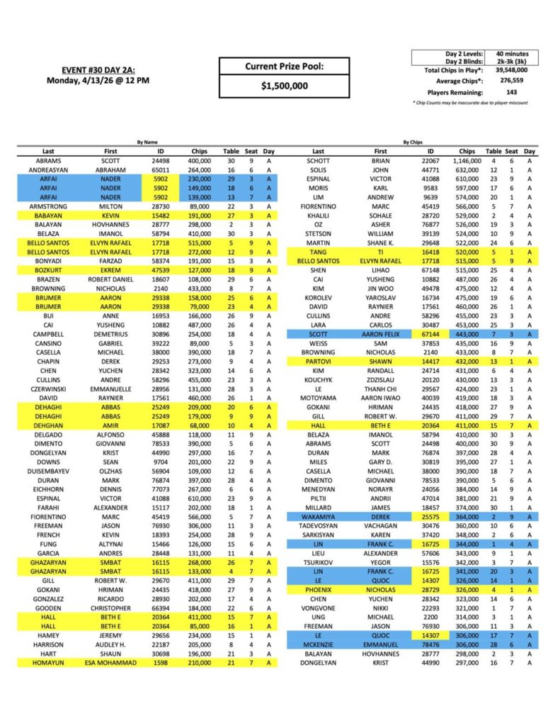Today is the eagerly anticipated Day 2A finals of the Mega Millions Main Event, and below you will see the full list of players who have earned a coveted Day 2 ticket to the finals today. Our overall chip leader Brian Schott will be here, with a stack that is over 500,000 more than his closest competitor, John Solis.