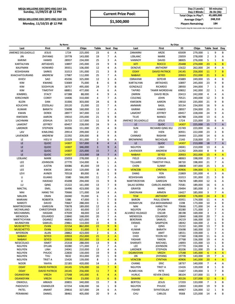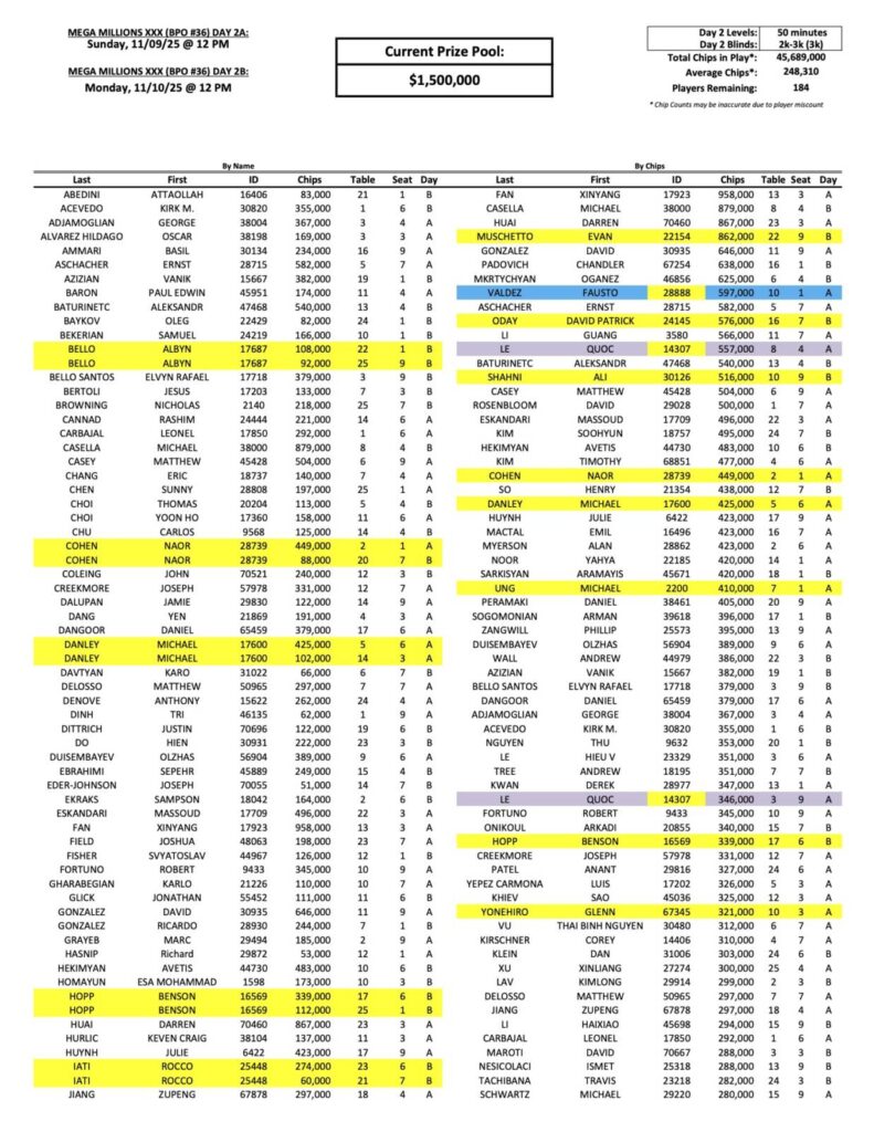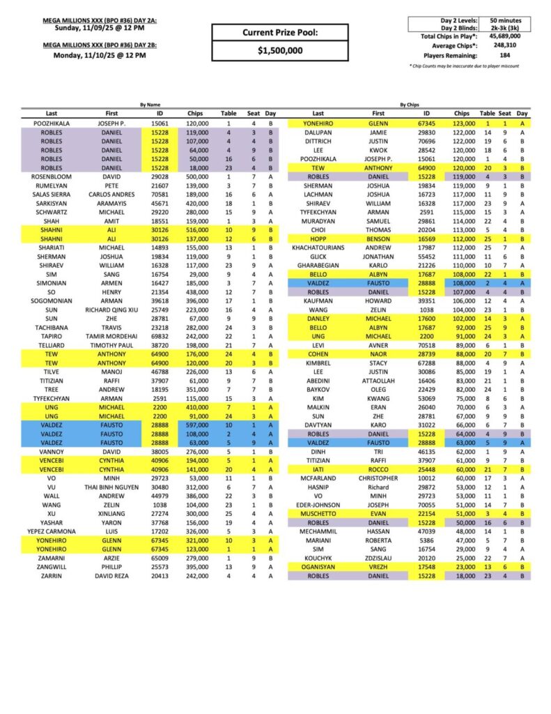 Earlier today we posted the return list for just those in the Day 2A finals. Below, you will see the full return list with the Day 2B Survivors as well. Remember, you can come down and buy-in for $3,500 today, or you can add your name to the final 2B list by qualifying through one of our two final sessions today, at 11 AM and 4 PM.