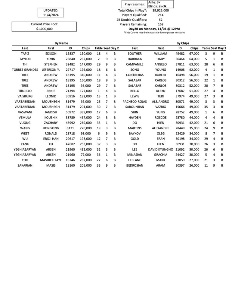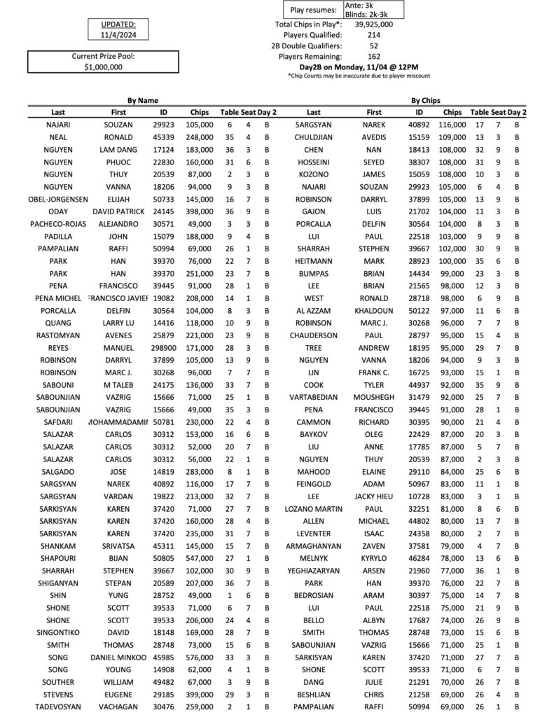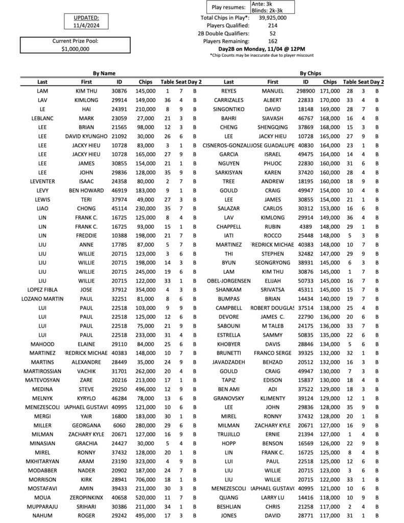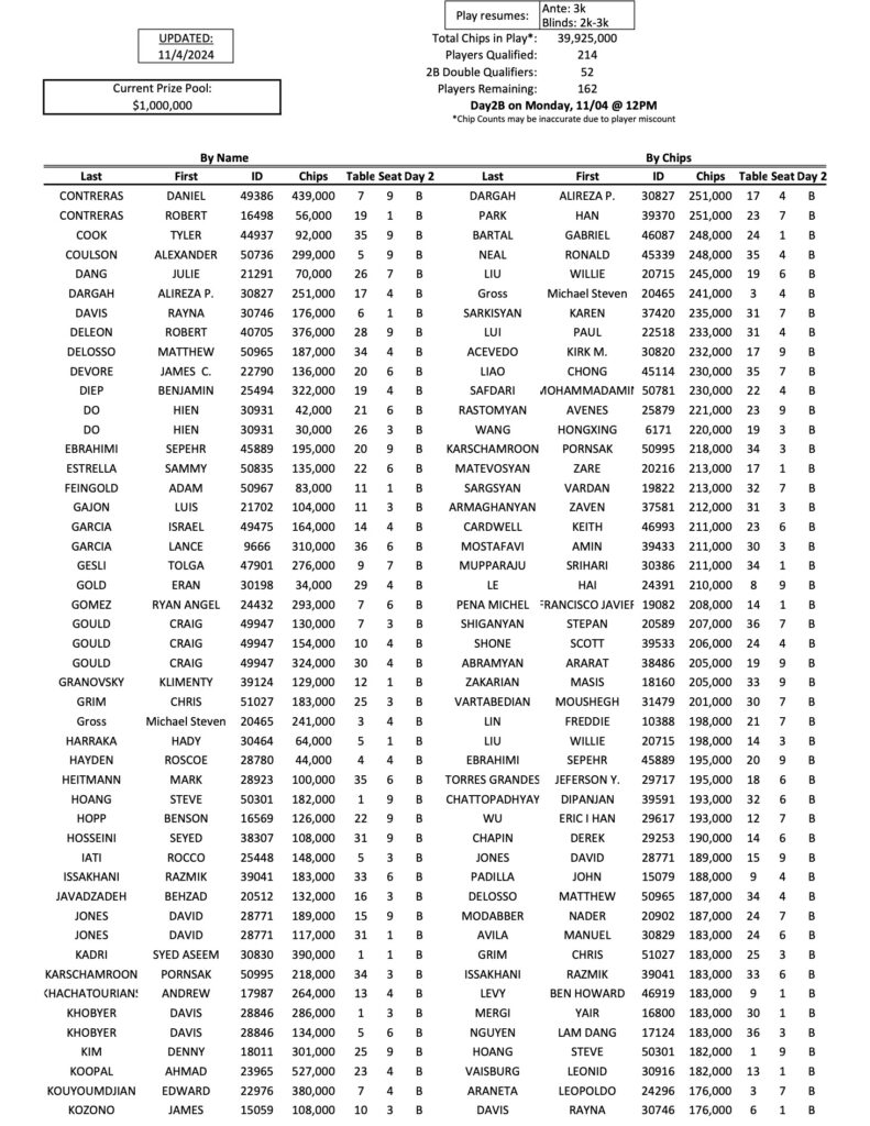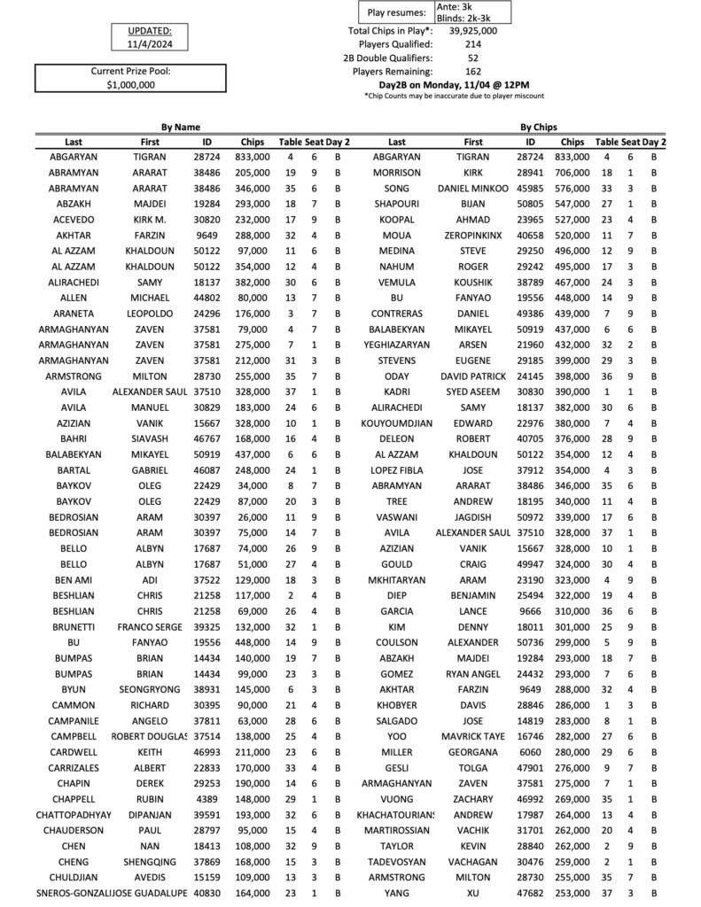 Below you will see the 162 players who are coming back today for the Day 2B restart of the Mini Mega Millions. As he has all week, Tigran Abgaryan leads the way with 833,000, while Kirk Morrison is in second today with 706,000.