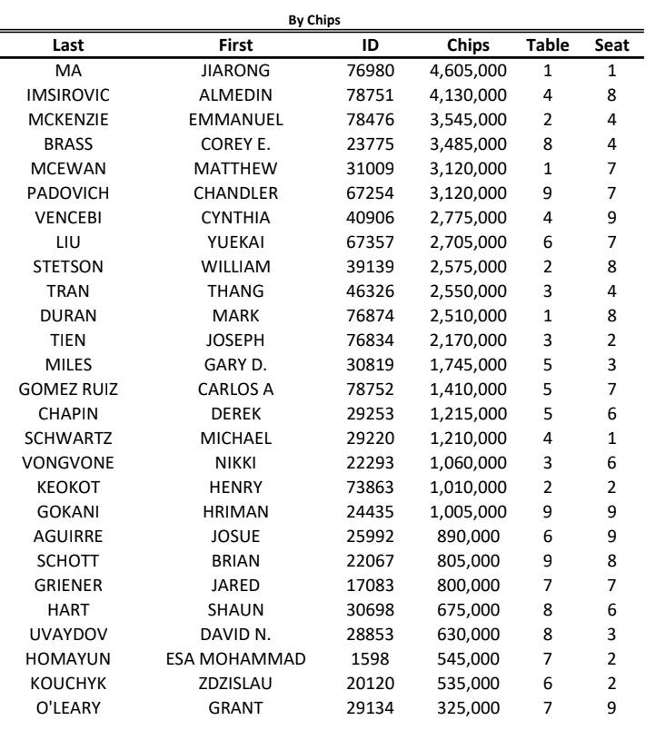 As we reported last night, Jiarong Ma finished on top of the counts at the end of our Day 2A restart, with 4,605,000. Former Mini Mega Millions champion Corey Brass was also in the top 5, while former champion of this event Esa Homayun is also still alive with a shot at making history as the first two time champion of this event.