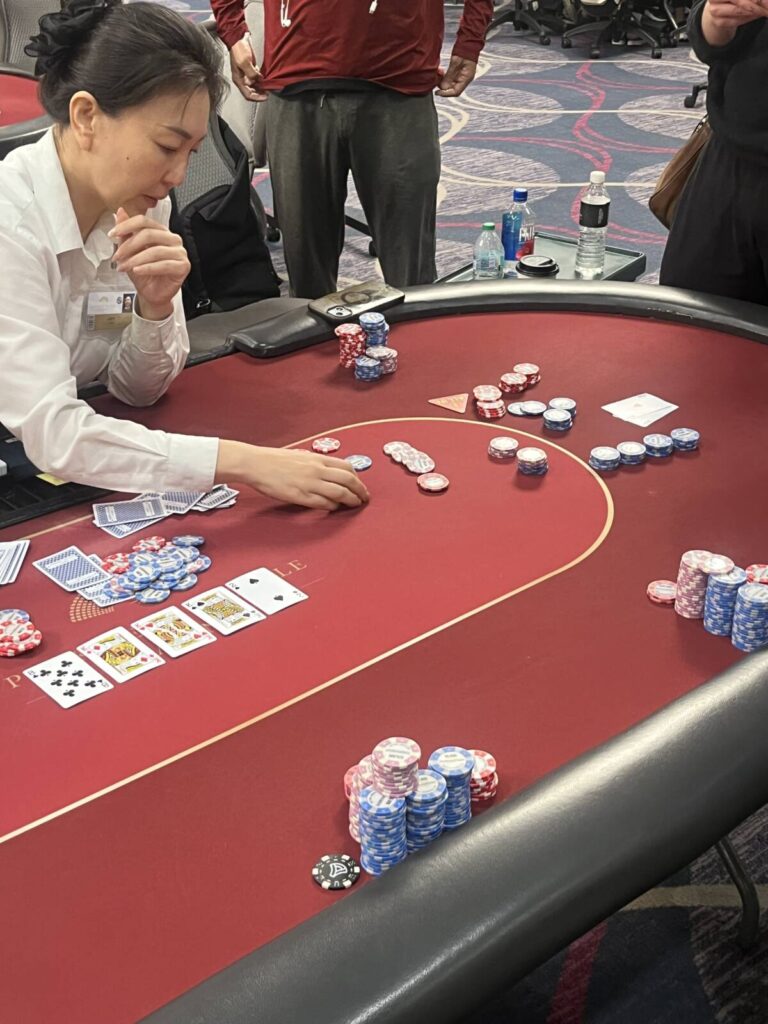 “It’s over,” someone said at the table, pointing out that all the aces were dead. However, a third king would still give the hand to the aces of Hastings, and sure enough, the [Kd] came right on the turn. Hastings immediately put his bag down and retook his seat, suddenly with a stack of over a million in chips after that wild runout!