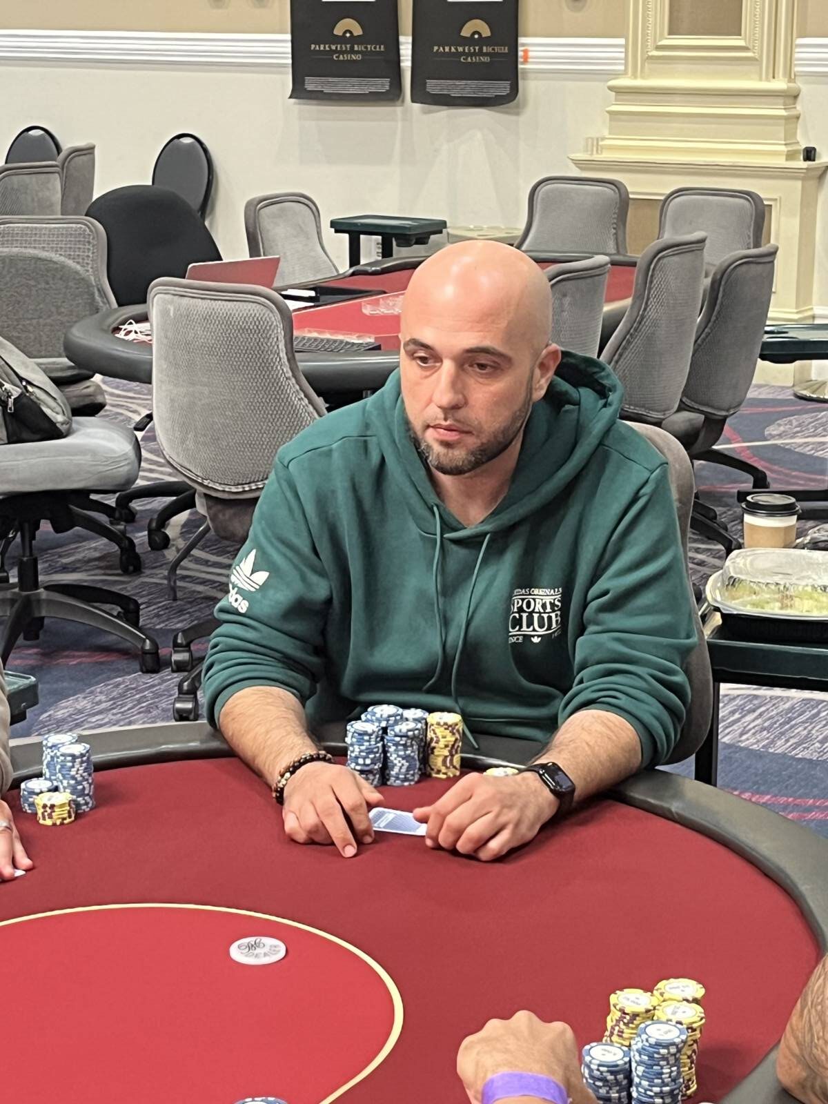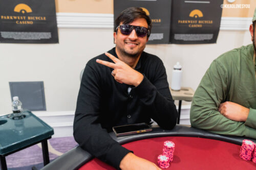 We are down to just 27 players here in the Kickoff Event, where the action is still fast and furious. We recently saw Bike floorman Larry Serbryany bust out after a tough river, when his pocket queens were rundown by an ace on the river from his opponent. On a different table, Aaron Zhang has shot up the leaderboard, now sitting with nearly two million in chips. Caleb Benton and Hriman Gokani (pictured above) are also two of the big stacks remaining with 1,600,000,