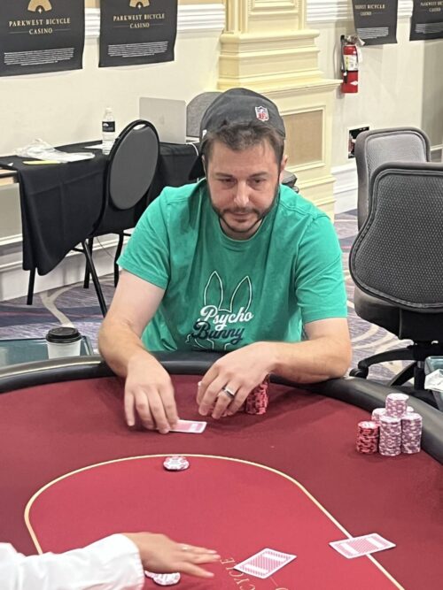 Just 45 players remain now, meaning we are 18 bustouts from being done for the evening! Bo Chen continues to lead the way, but former Mini Mega Millions winner Corey Brass is adding to his stack, and pushing for the lead himself. Stay tuned for more updates from tonight’s play.