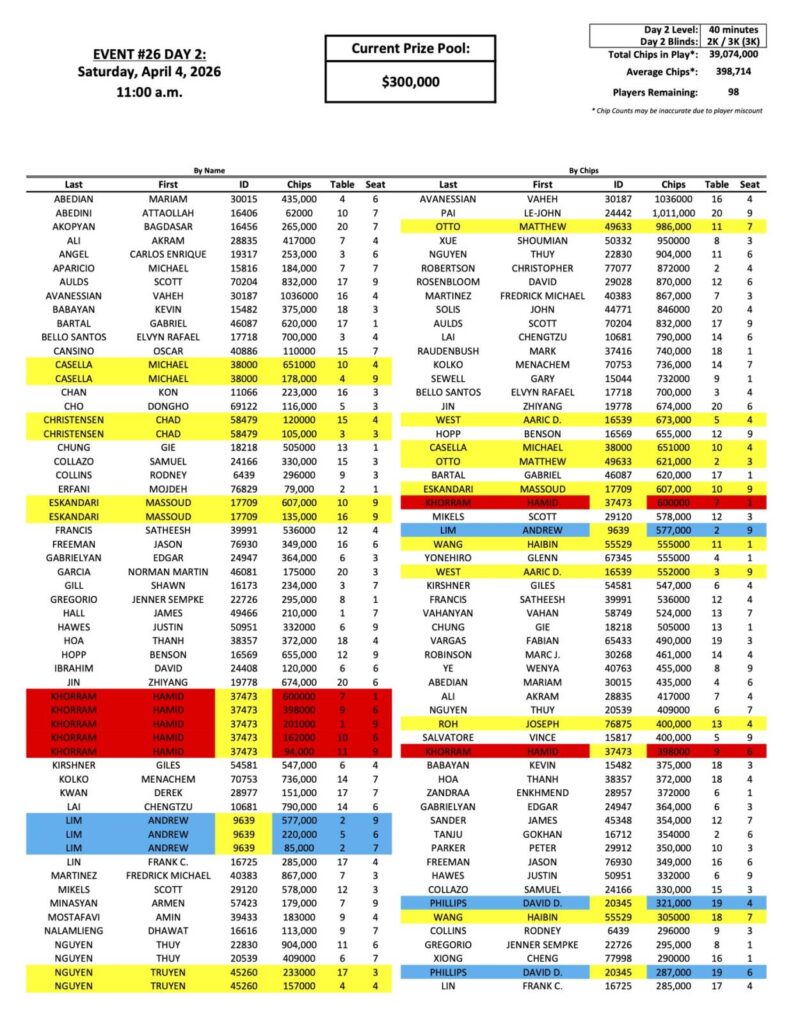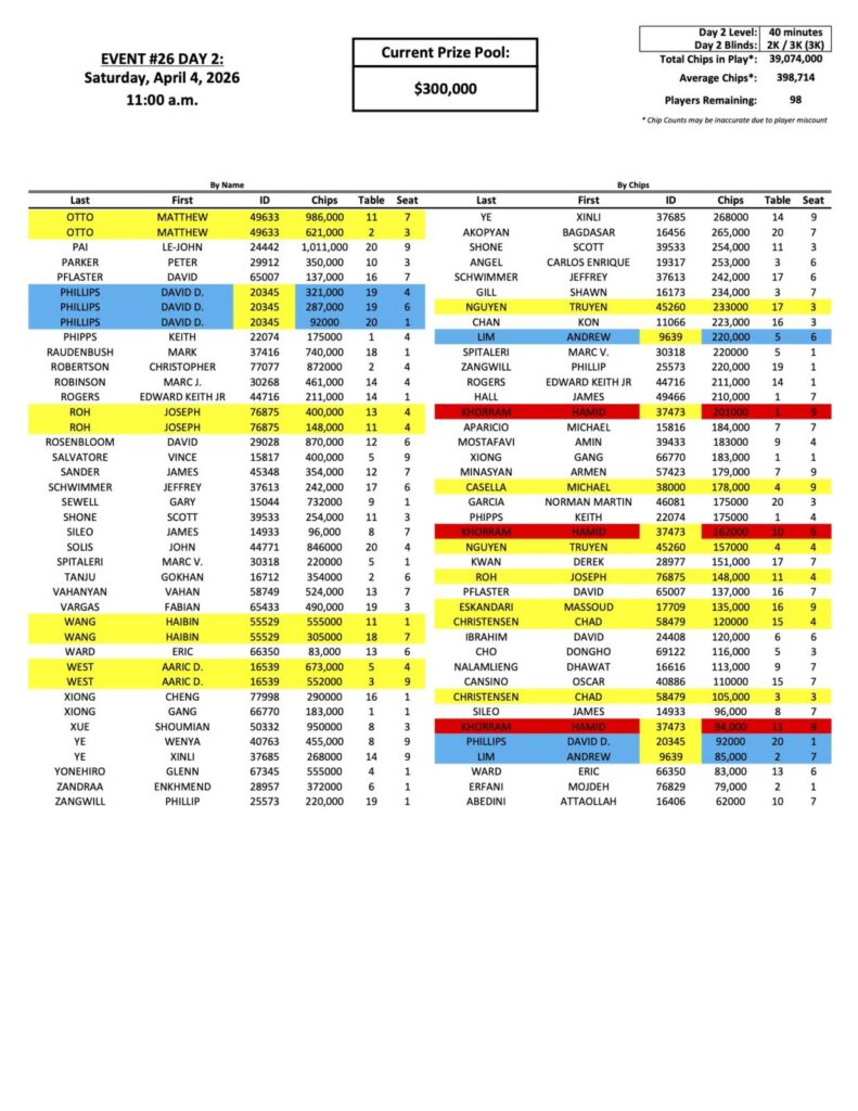 Updated Day 2 Return List for the $300,000 Guaranteed Event