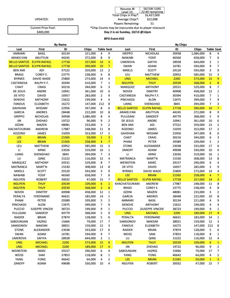After the Wednesday Day 1 sessions, a total of 51 players have punched their tickets to the Day 2 finals on Sunday. We have a new chip leader, Nicholas Grippo (pictured above at a previous event), and he has a stack that will be tough to beat, as he has cracked the one million chip marker.