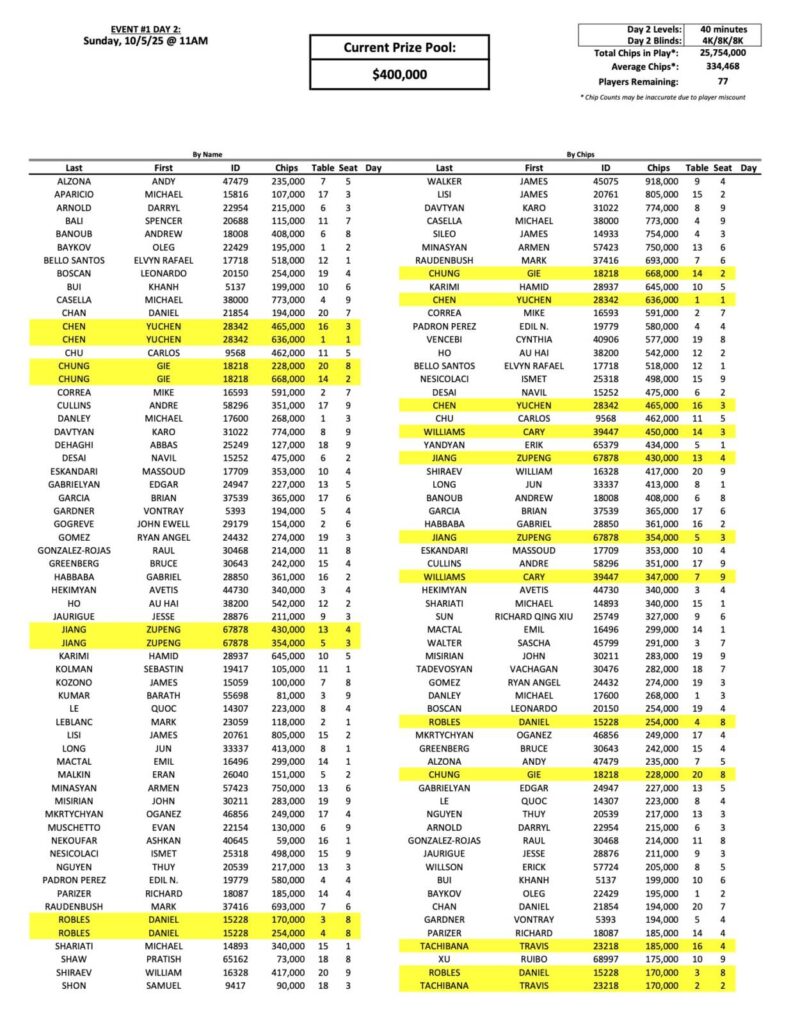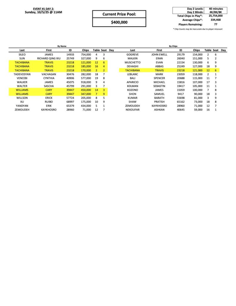 As we get ready for the penultimate day of $400,000 Guaranteed qualifying, where a total of 77 players have moved on to the Day 2 finals. Mac Walker (pictured above) maintains his lead with 918,000. One of yesterday’s flights ended at 4,000/8,000, so those are the starting blinds for Day 2 at the moment.