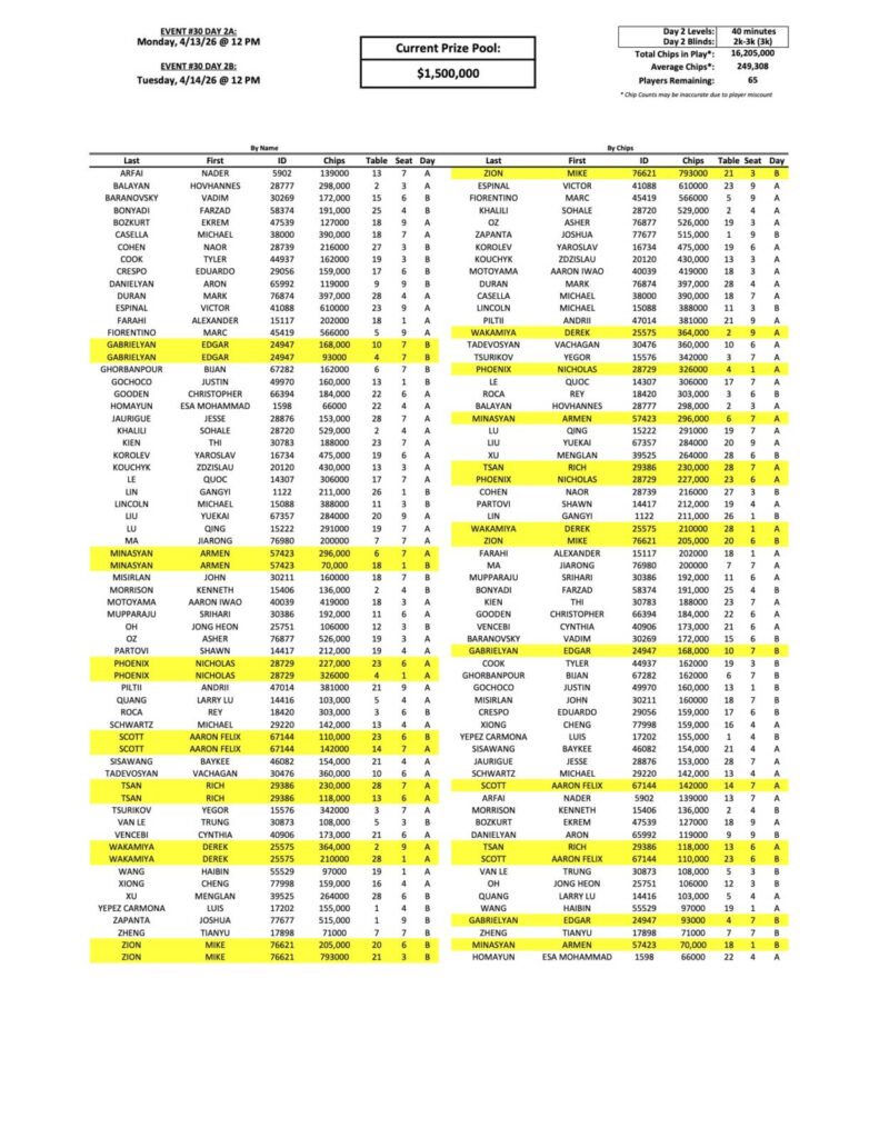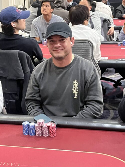 Victor Espinal is also continuing his stellar play this series. Espinal already has a 3rd place finish and a five way chop in the Mini Mega Millions under his belt, and he’s set himself up for another deep run here with a stack of 610,000.