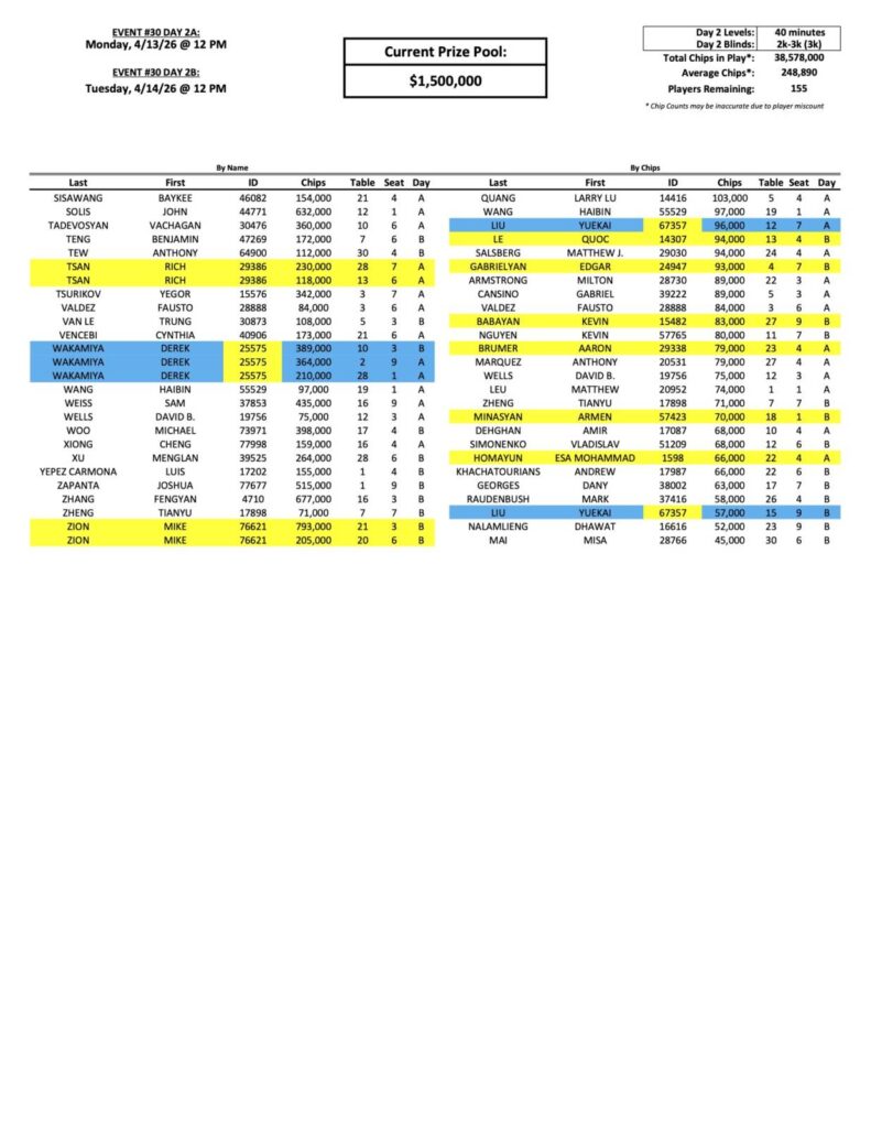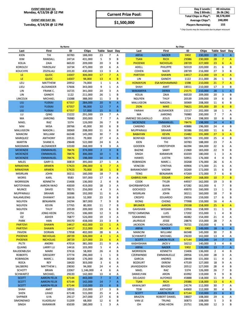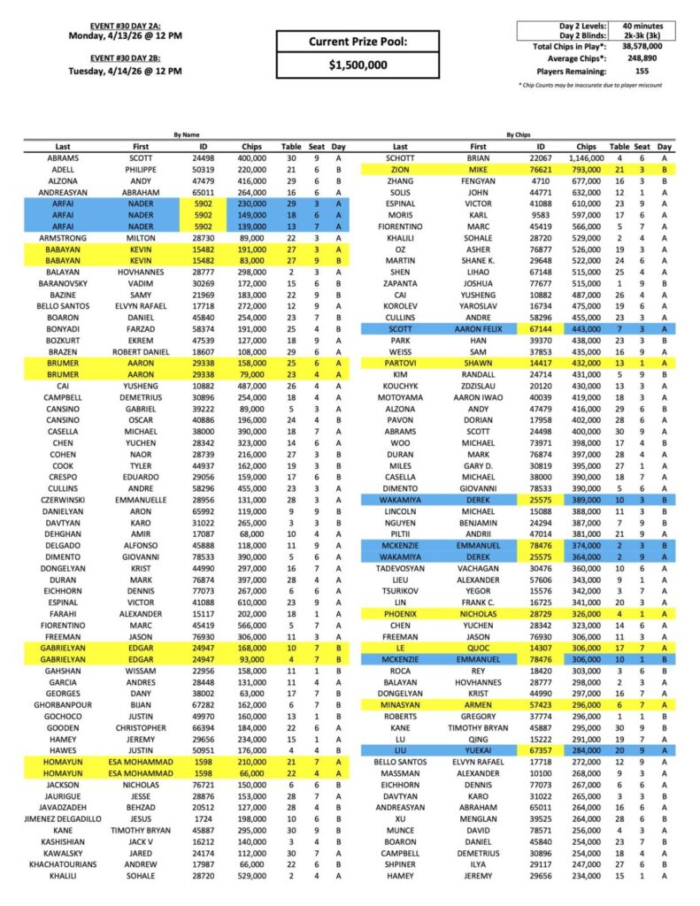 The Day 2 return list for the Mega Millions Event continues to grow here at the Bike, as 155 players have now advanced. One of those new players is our new chip leader, Brian Schott, who bagged a whopping 1,146,000. To put that in perspective, the next biggest stack has less than 800,000.