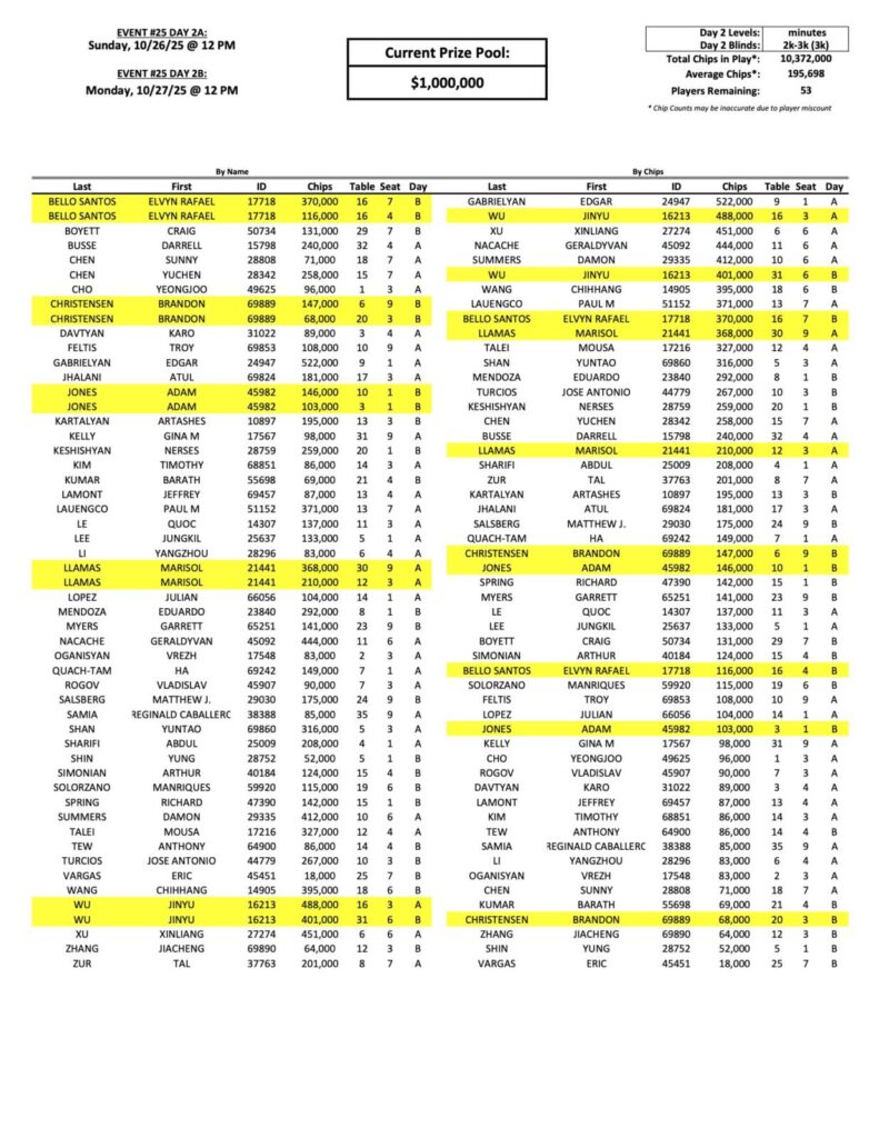 After two days of qualifying, 53 players have moved on to the Day 2 finals, and we have five double qualifiers already. Everyone is still chasing Edgar Gabrielya, who has over half a million in chips.
