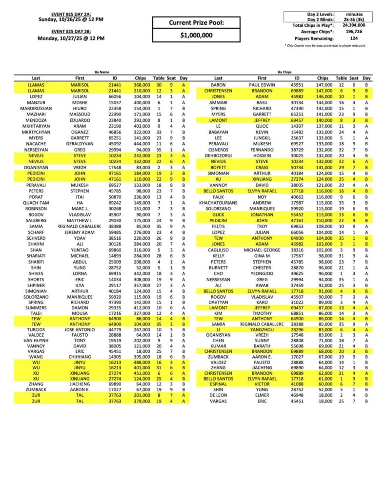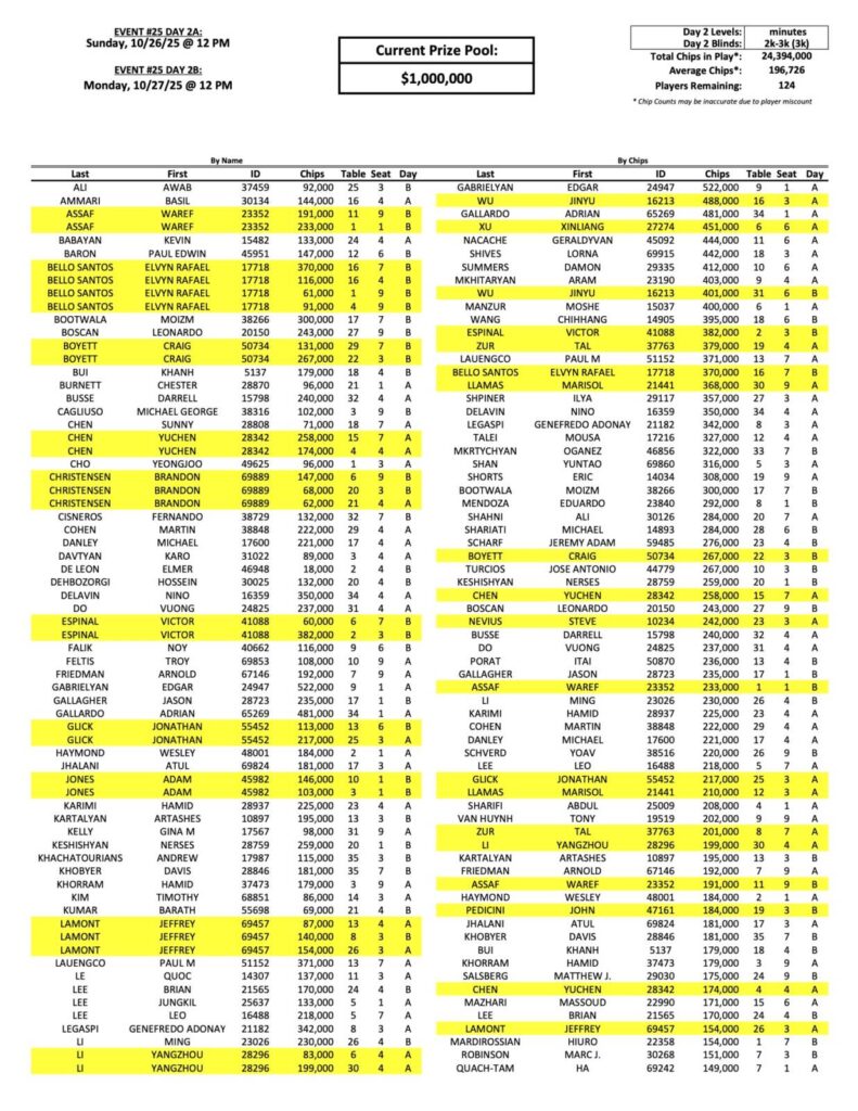 Below you will see the updated day 2 return list for our Mini Mega Millions Event, which is now up to 124 players. Edgar Gabrielyan continues to lead the way with 522,000 in chips. We have more starting sessions for you tomorrow, starting up at 11 AM!
