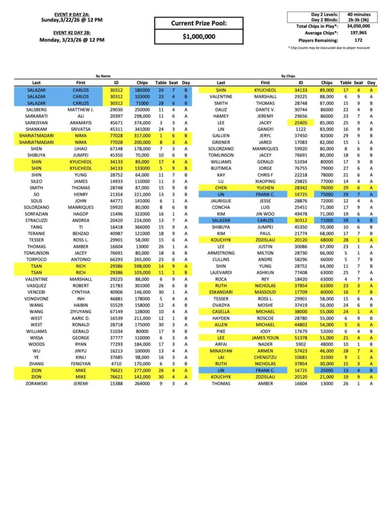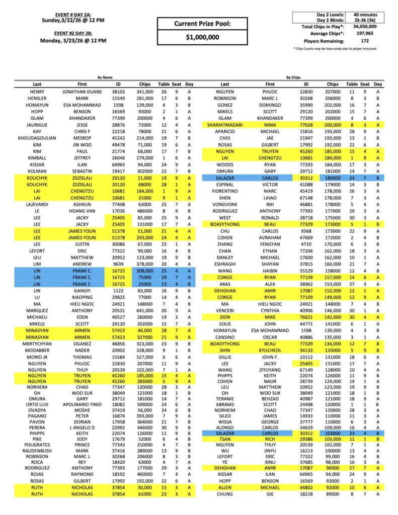 We have had 172 players move on to the Day 2 finals of the Mini Mega Millions so far, with a familiar face to the Bike at the top, Edgar Gabrielyan. Anthony Marquez,  (pictured above at a previous event),  Sunny Chen, Frank Lin, Michael Casella, and Marc Fiorentino have also advanced.