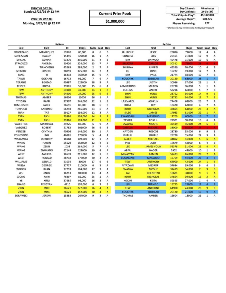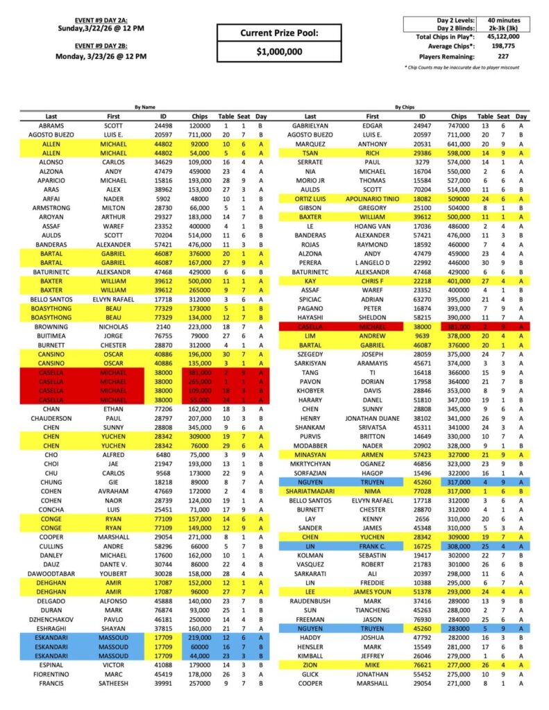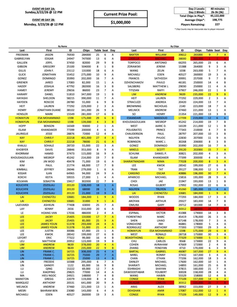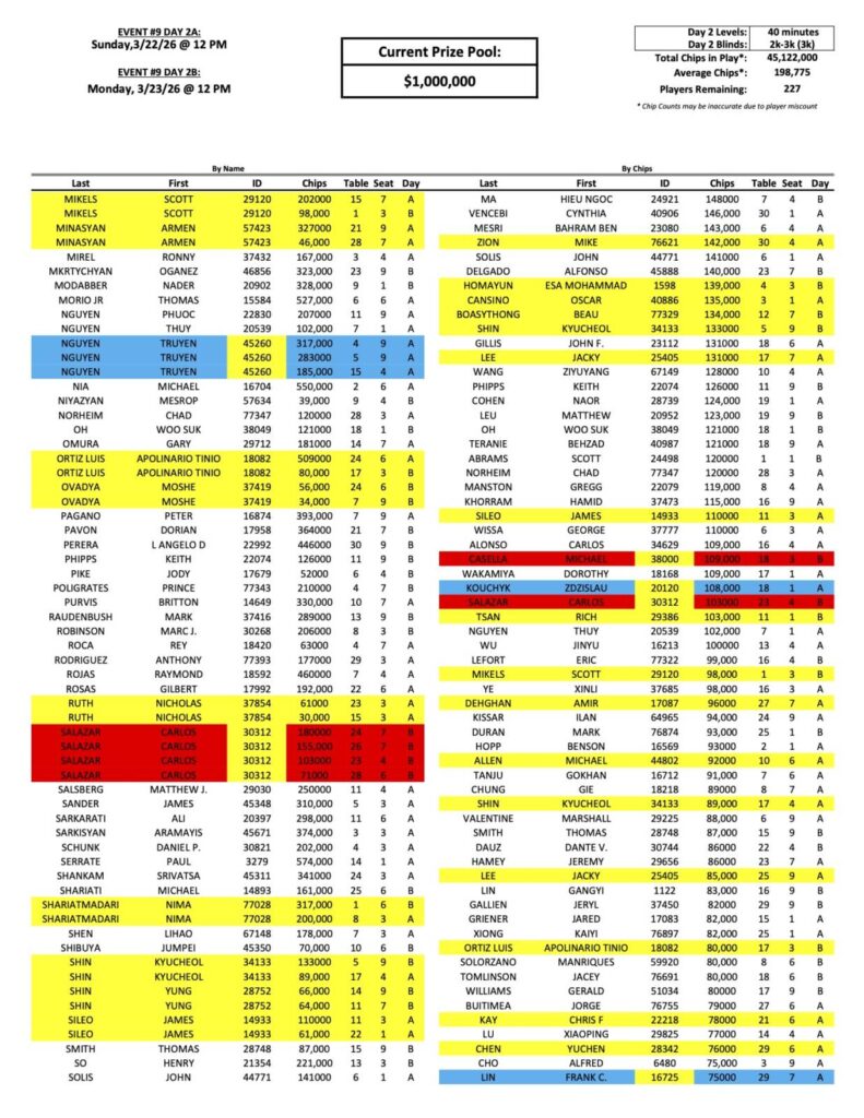 We have had 227 players move on to the Day 2 finals of the Mini Mega Millions so far, with a familiar face to the Bike at the top, Edgar Gabrielyan. Anthony Marquez, (pictured above at a previous event), Sunny Chen, Frank Lin, Michael Casella, and Marc Fiorentino have also advanced.
