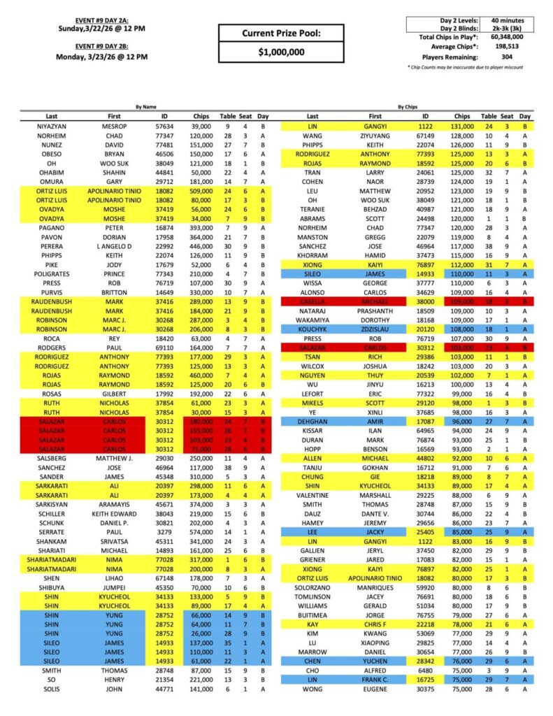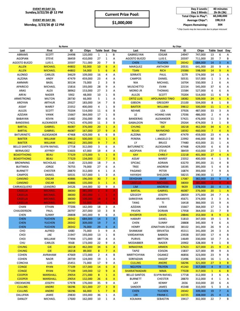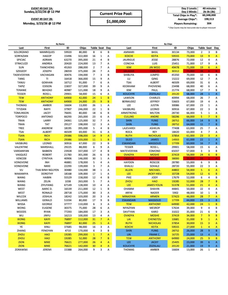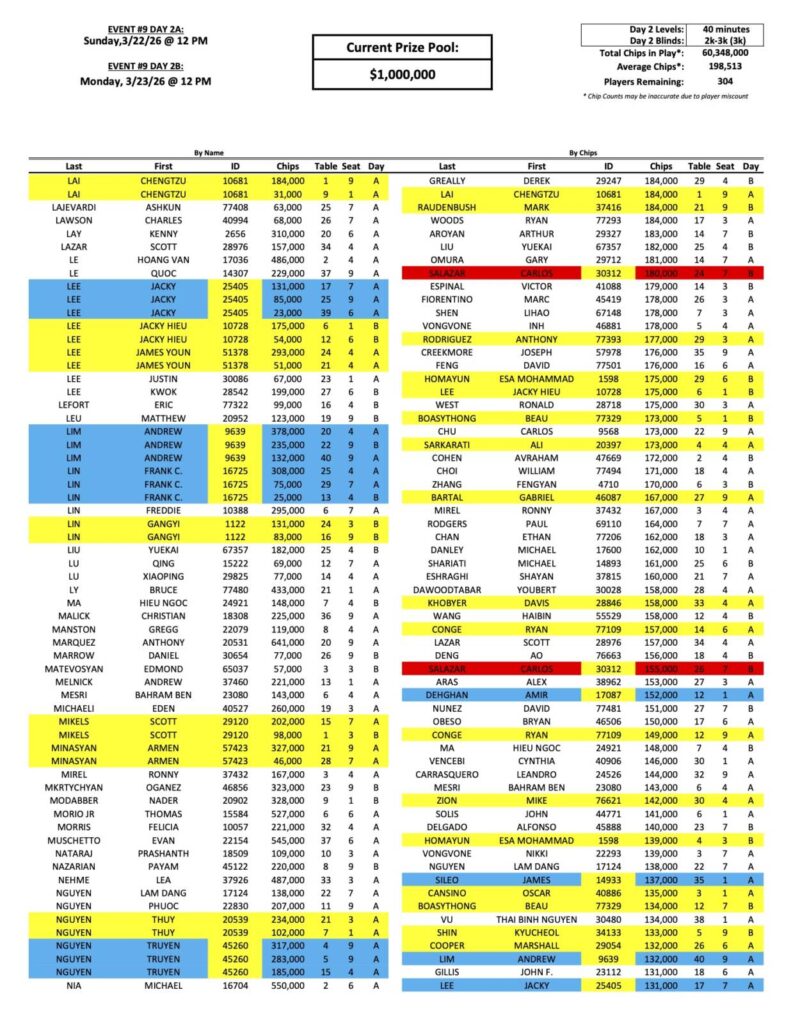 The Day 2 return list for the latest Mini Mega Millions is up to over 300 players now, with Bike regular Edgar Gabrielyan still leading the way. We have a new face towards the top of the counts, none other than former Mega Millions champion Yuchen Chen (pictured above), who is also fresh off of chopping the Big 4 Event last week for nearly $90,000!