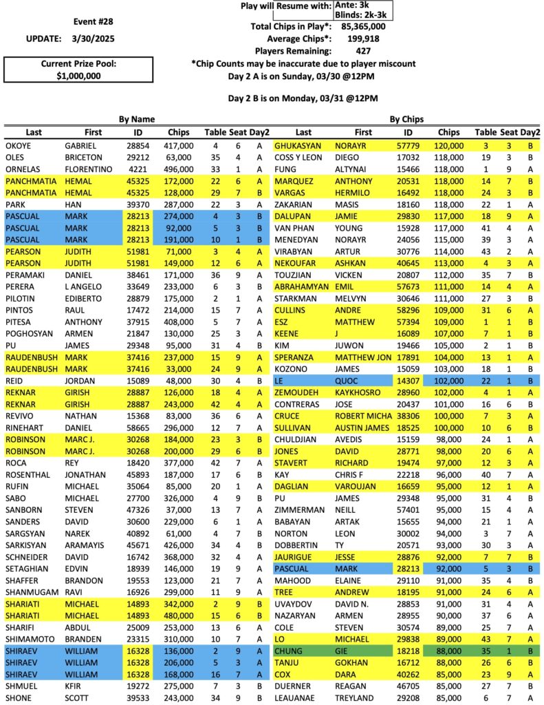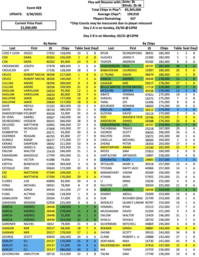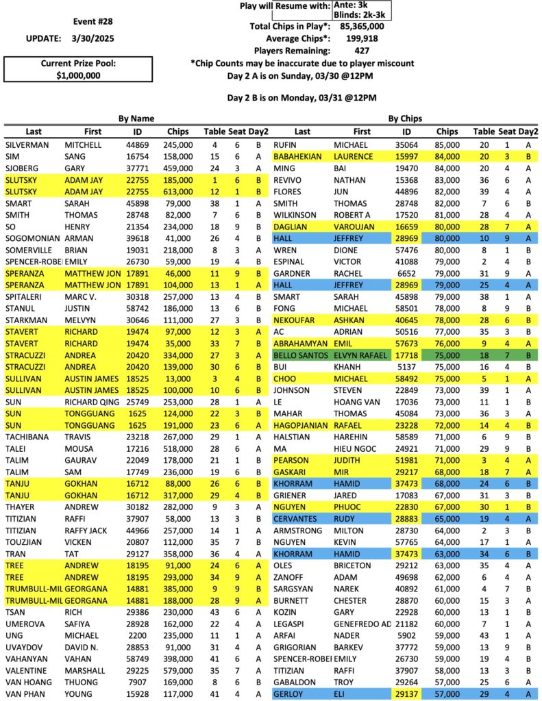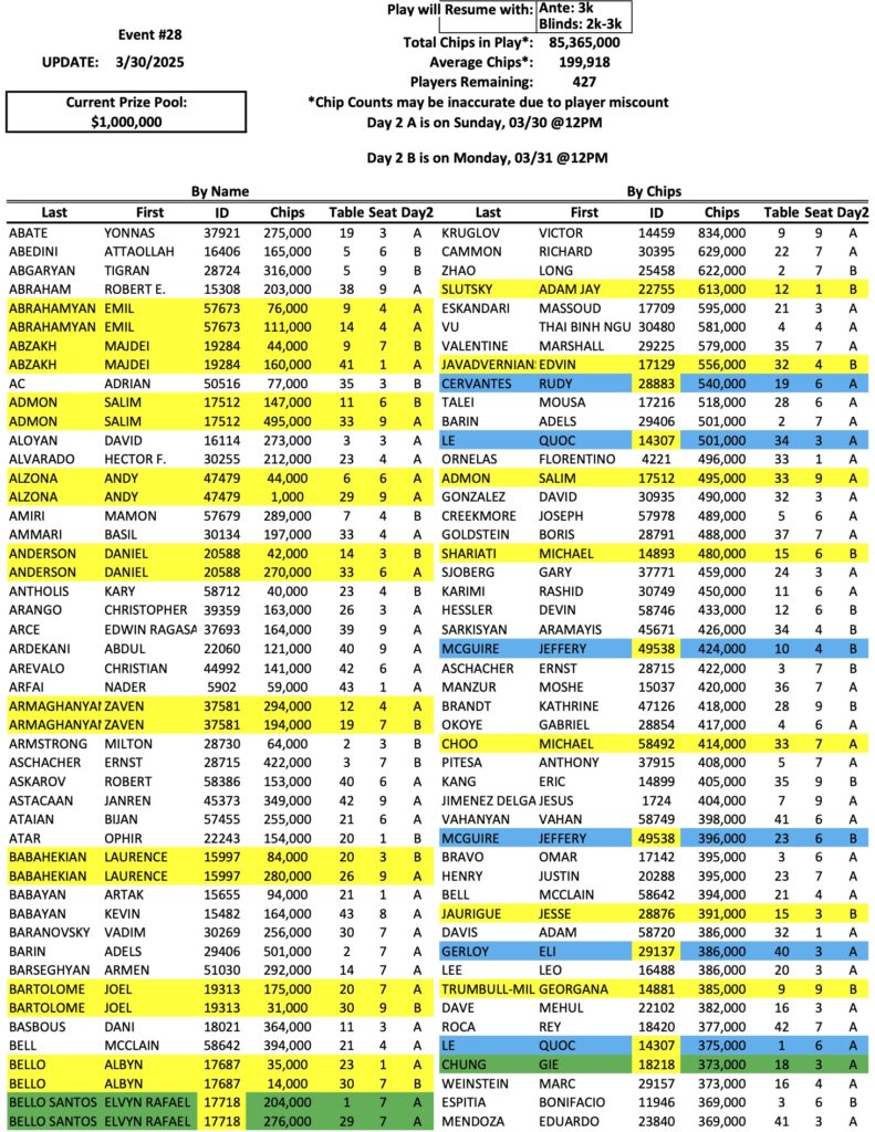 The Day 2 return list for the Mini Mega Millions is up to 427 players now, as we enter the first of two different Day 2 sessions. As we reported last night, Victor Kruglov is the new chip leader with 834,000. Bike regular Rudy Cervantes (pictured above) is also in the top ten now with 540,000. Check out the full list of Day 2 chips below, and remember that we have three more sessions today, at 11 AM, 2 PM, and 4 PM.