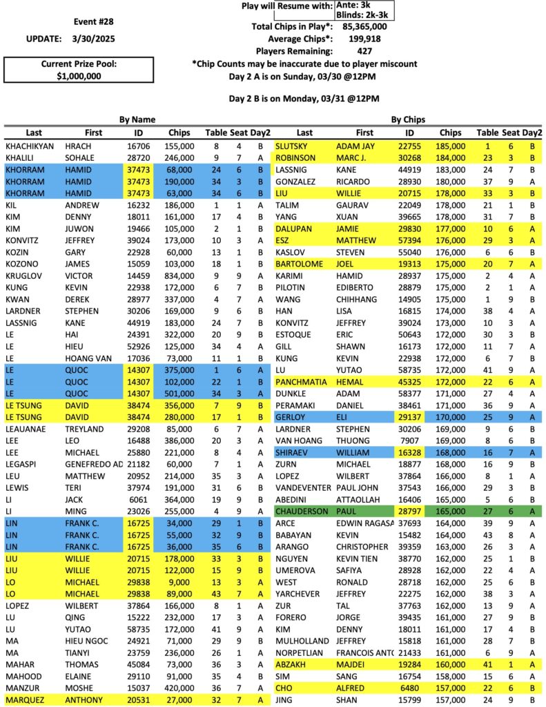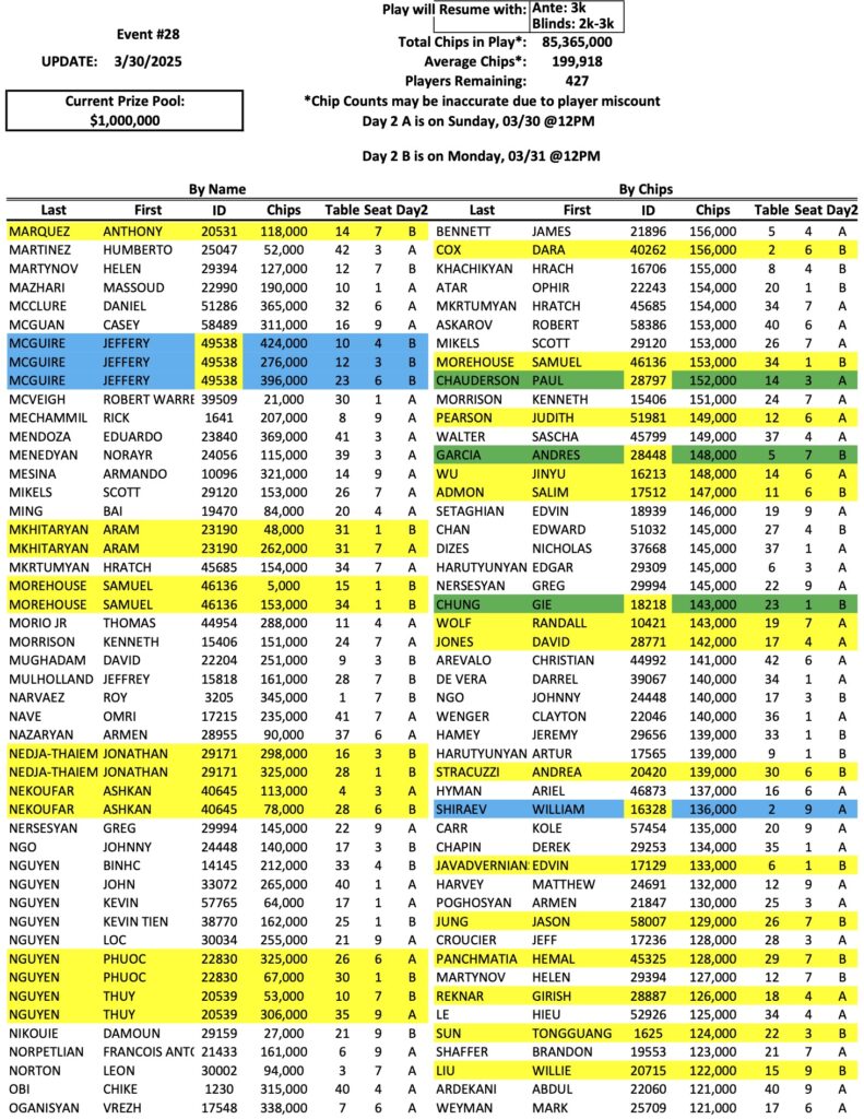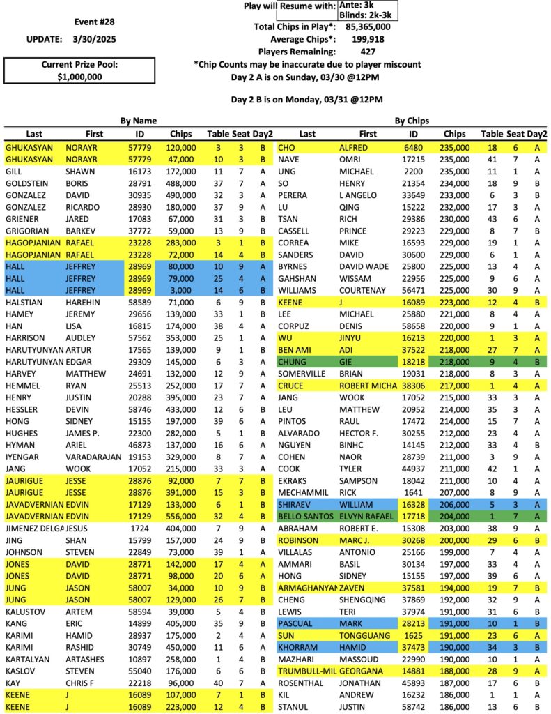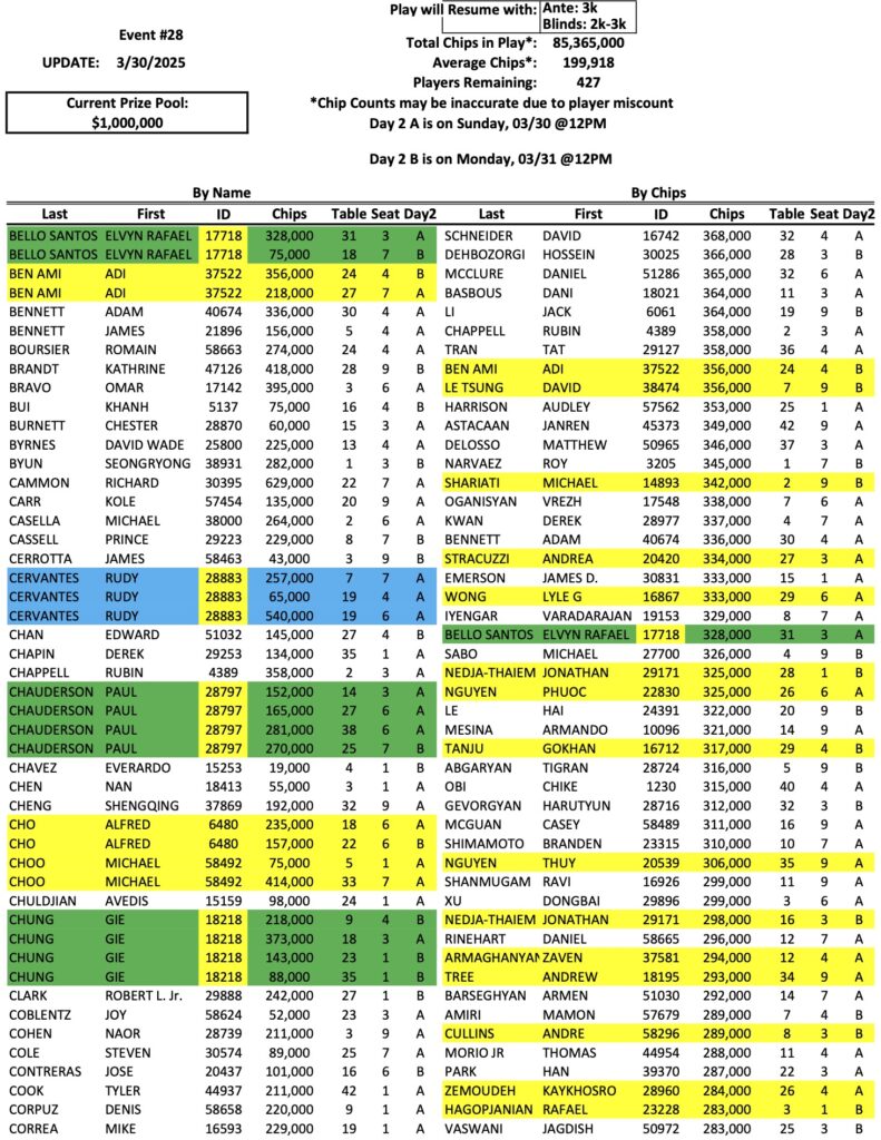 The Day 2 return list for the Mini Mega Millions is up to 427 players now, as we enter the first of two different Day 2 sessions. As we reported last night, Victor Kruglov is the new chip leader with 834,000. Bike regular Rudy Cervantes (pictured above) is also in the top ten now with 540,000. Check out the full list of Day 2 chips below, and remember that we have three more sessions today, at 11 AM, 2 PM, and 4 PM.