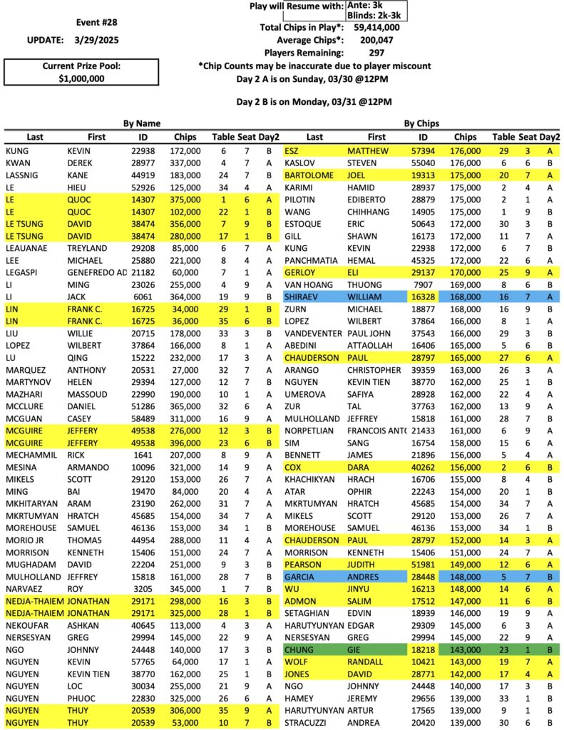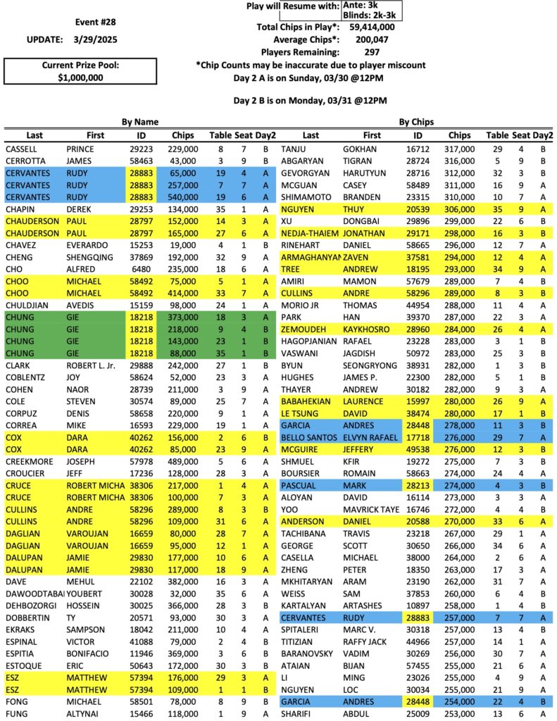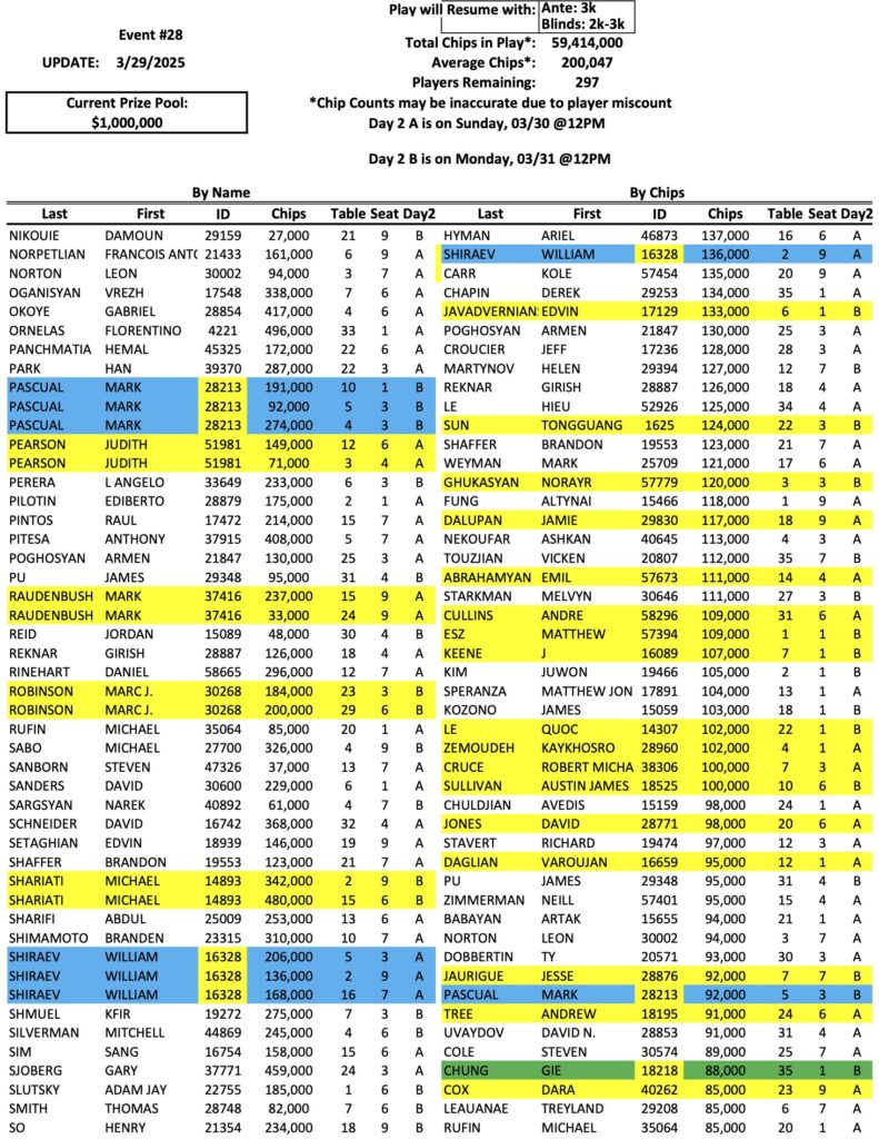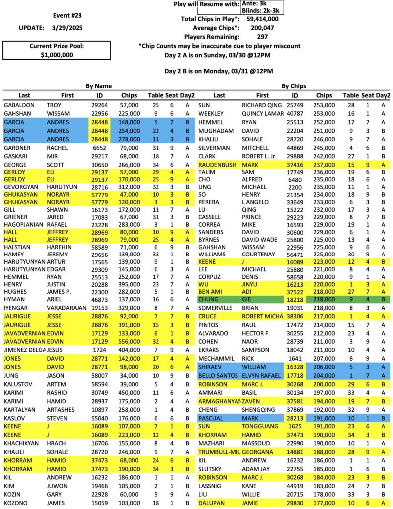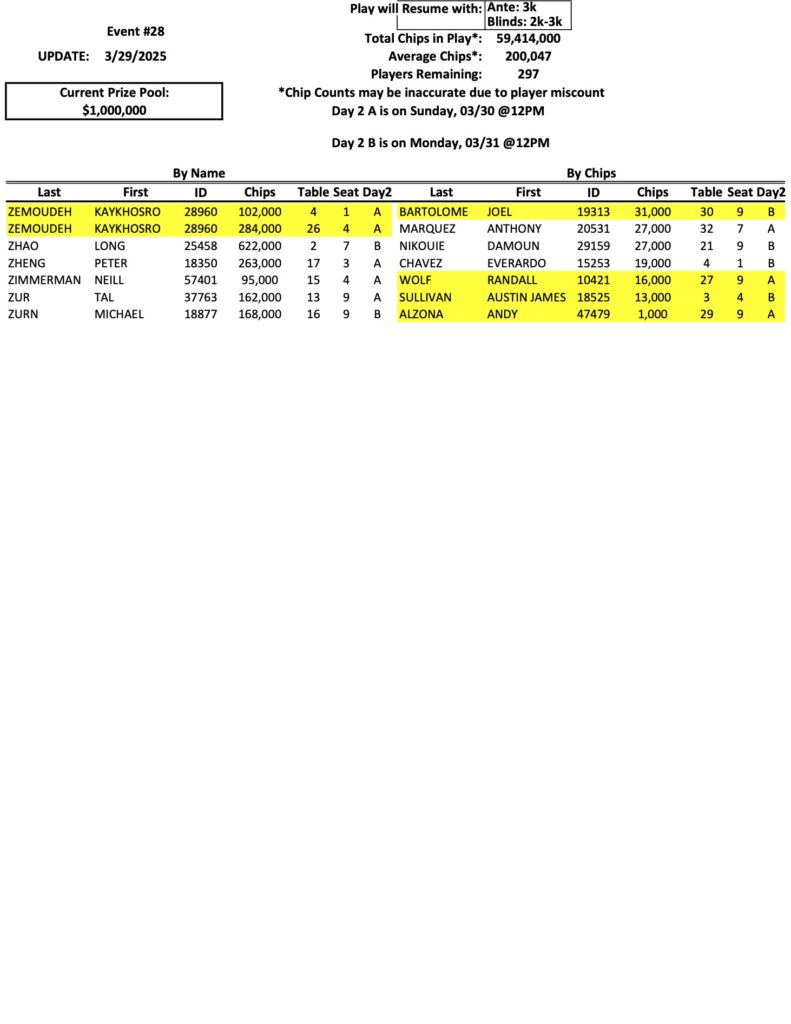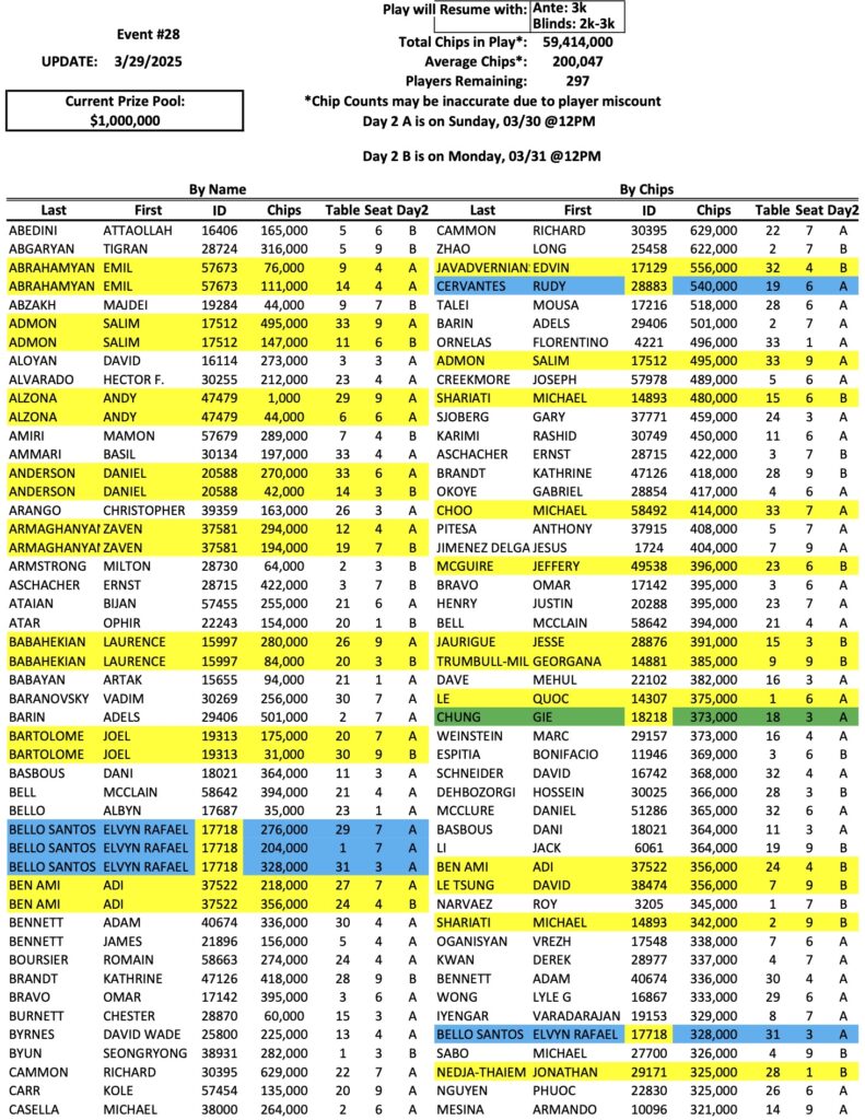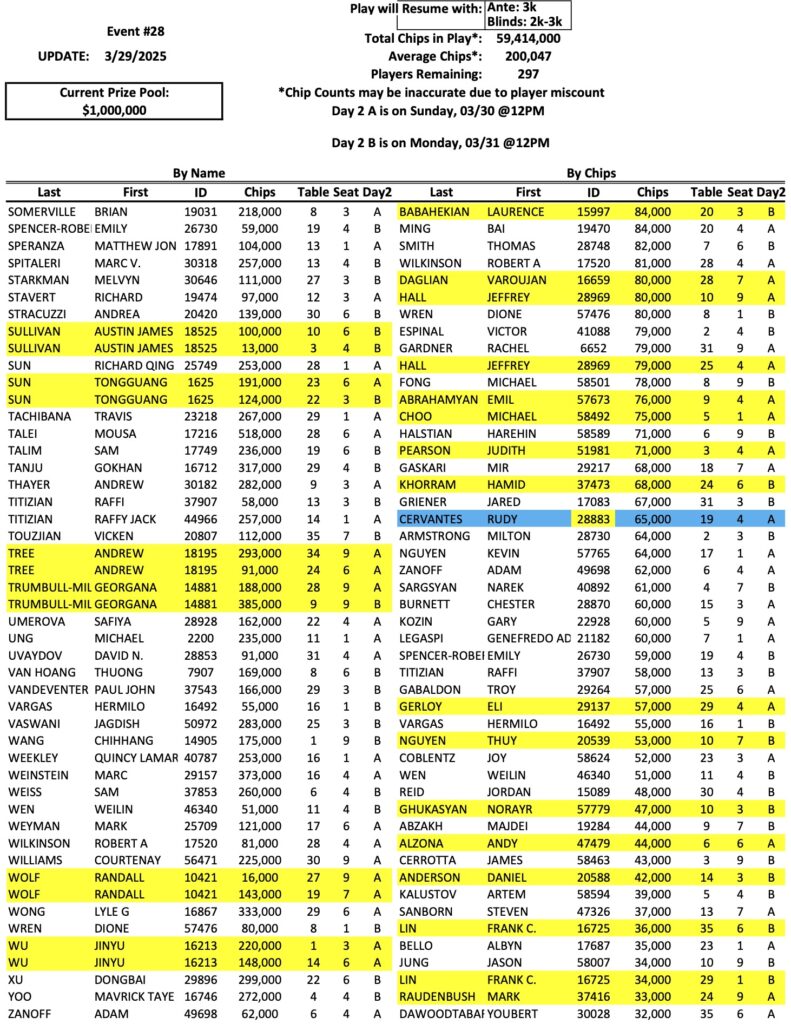 The Day 2 return list for the Mini Mega Millions is up to 297 players now, as we enter the Saturday starting sessions. Richard Cammon leads the way now with 629,000. Bike regular Rudy Cervantes (pictured above) is also in the top ten now with 540,000. Check out the full list of Day 2 chips below, and remember that we have three more sessions today, at 11 AM, 2 PM, and 4 PM.