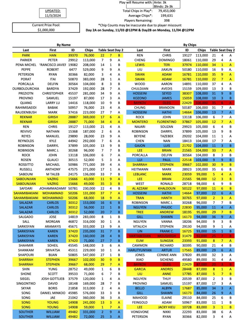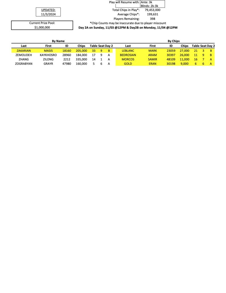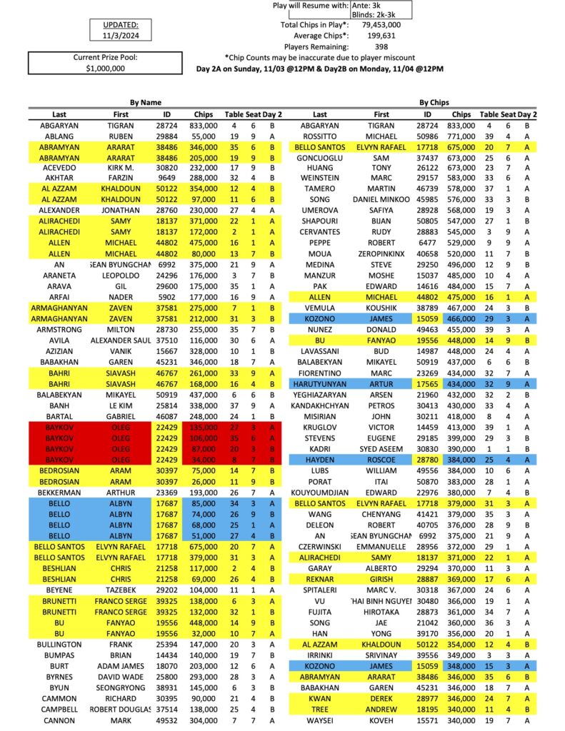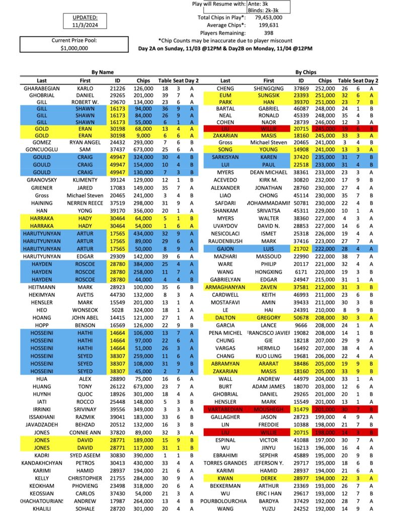 We have finally arrived at the first Day 2 of the Mini Mega Millions, as a total of 398 players have qualified for the restarts today and tomorrow. As he has all week, Tigran Abgaryan (pictured above at a previous event) continues to lead the way with 833,000 in chips, while Michael Rossitto is now in second.