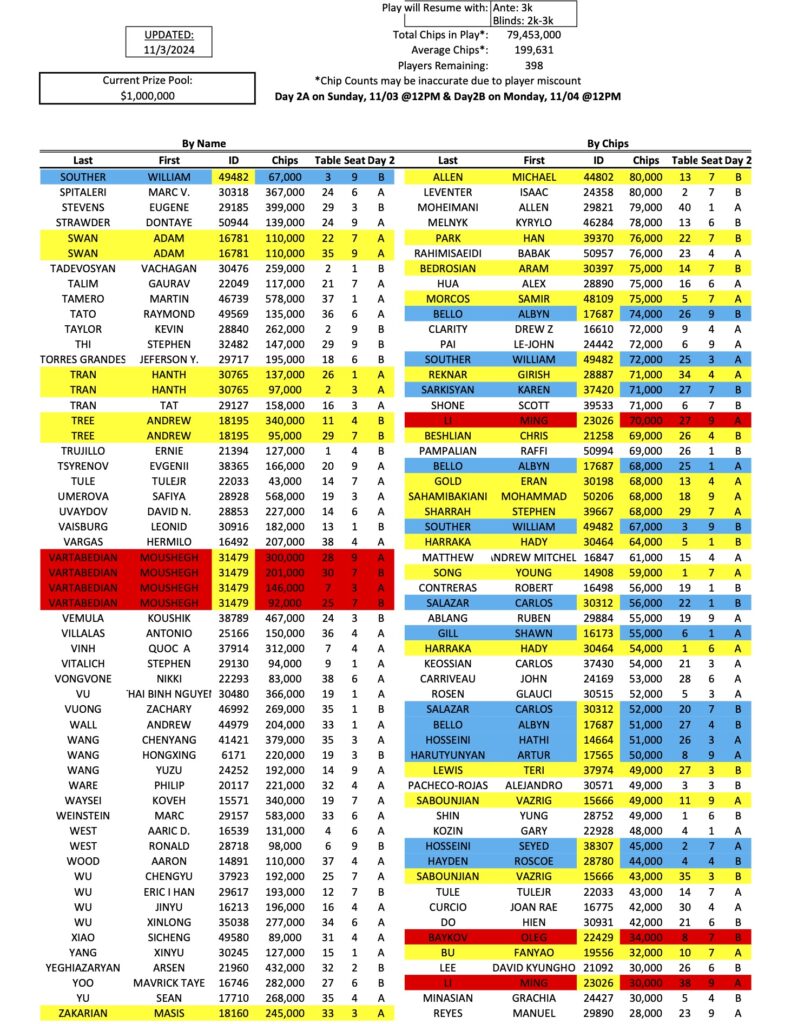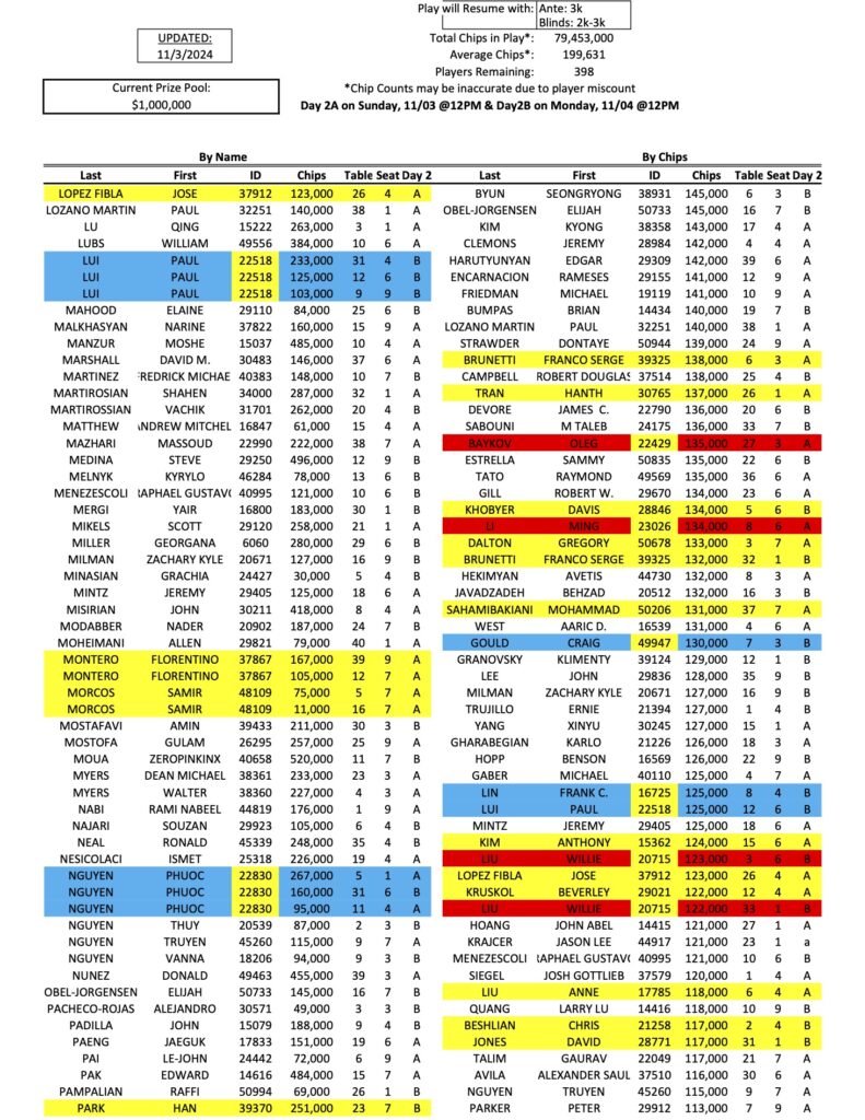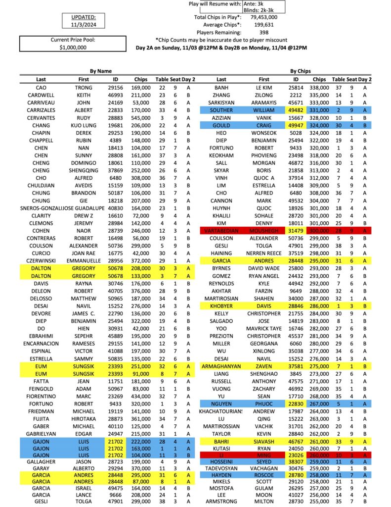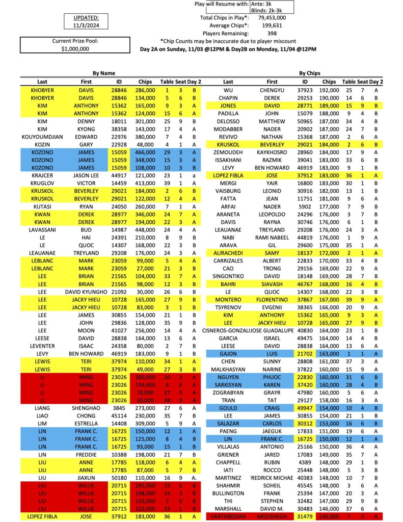 We have finally arrived at the first Day 2 of the Mini Mega Millions, as a total of 398 players have qualified for the restarts today and tomorrow. As he has all week, Tigran Abgaryan (pictured above at a previous event) continues to lead the way with 833,000 in chips, while Michael Rossitto is now in second.