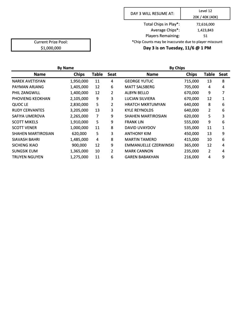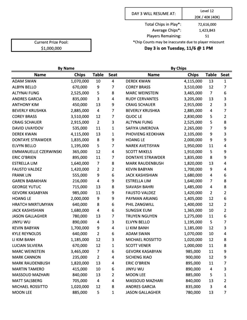 Yesterday, 51 players advanced to the Day 3 finals tomorrow at the Mini Mega Millions, and you can view that list below. Remember that if you aren’t on this list, you can come down today before the start of Level 4 (roughly 2:20 PM) to buy in directly for $1,400 to try and add your name to this list!